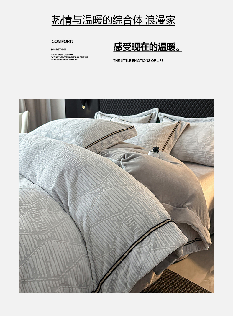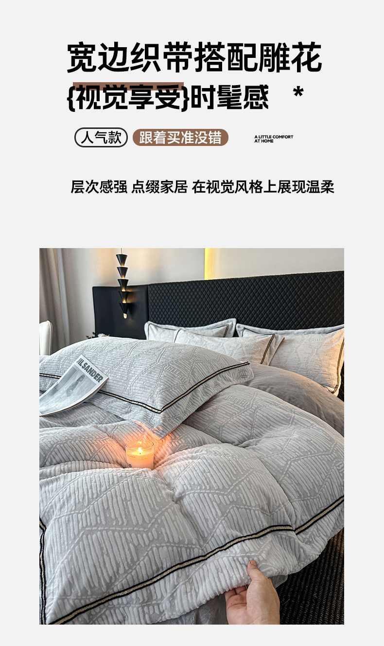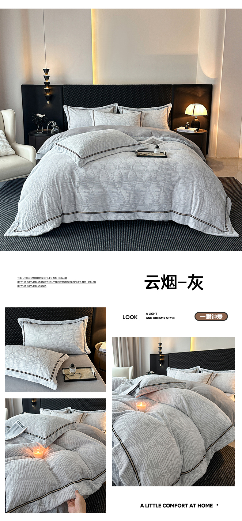 商品名称:诺梵家纺 2025新款8.2斤宽边织带雕花绒牛奶绒四件套 云烟-灰