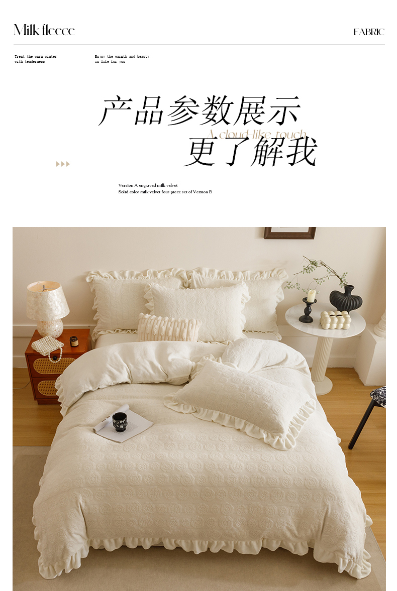 商品名称:忆生活家纺 2025秋冬韩版公主风雕花牛奶绒四件套-小香茶花系列 小香茶花-象牙白
