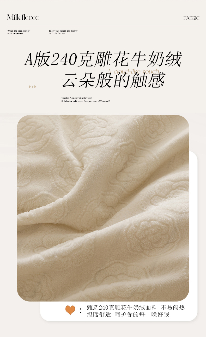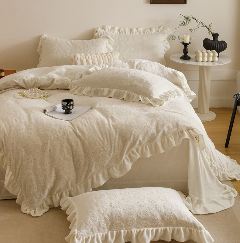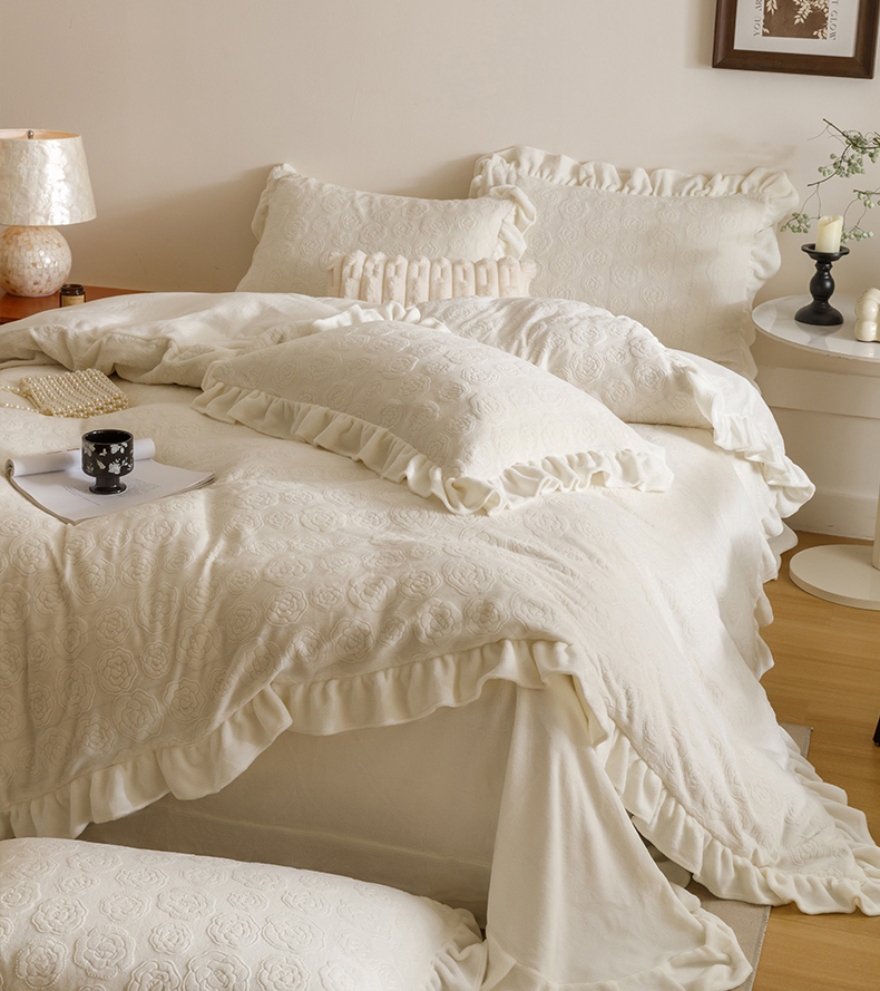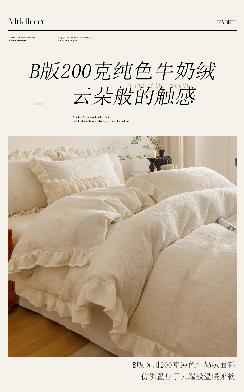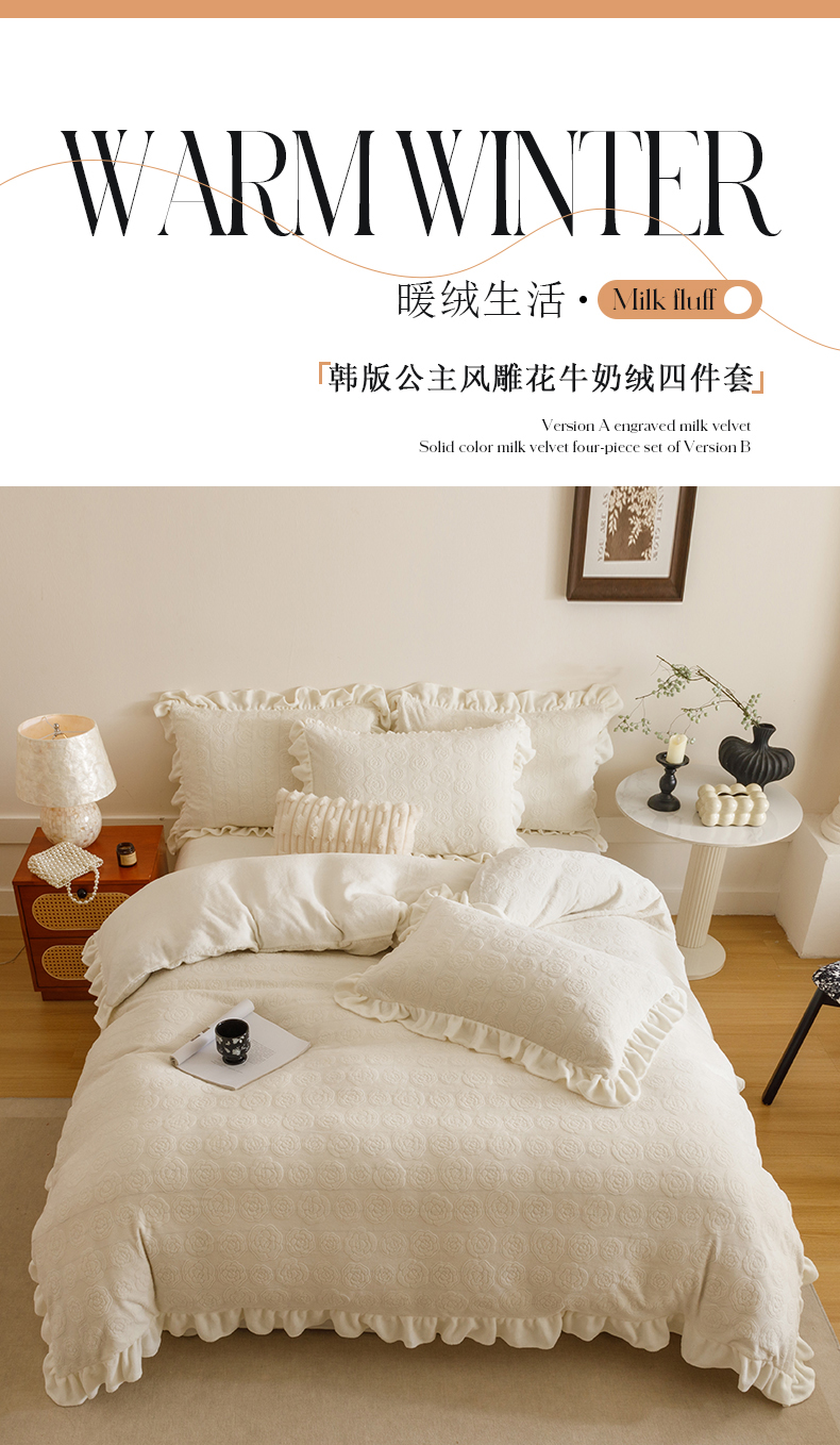 忆生活家纺 2025秋冬韩版公主风雕花牛奶绒四件套-小香茶花系列 小香茶花-象牙白