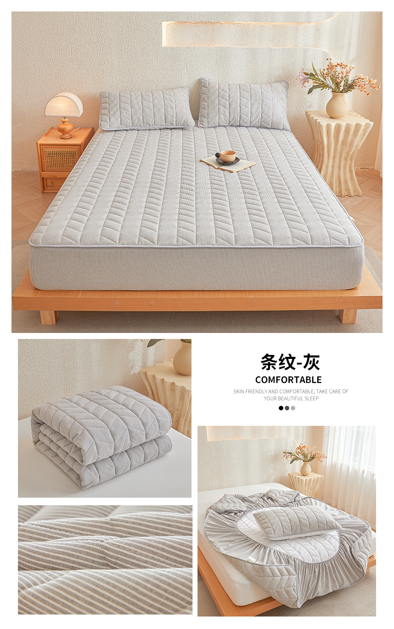 (总)优眠坊 2025新品日式无印风全棉色织水洗棉夹棉加厚抗菌纤维绗缝床笠,方格-卡其,方格-抹茶绿,方格-玉色,条纹-灰,条纹-卡其,条纹-清新绿,条纹-玉色