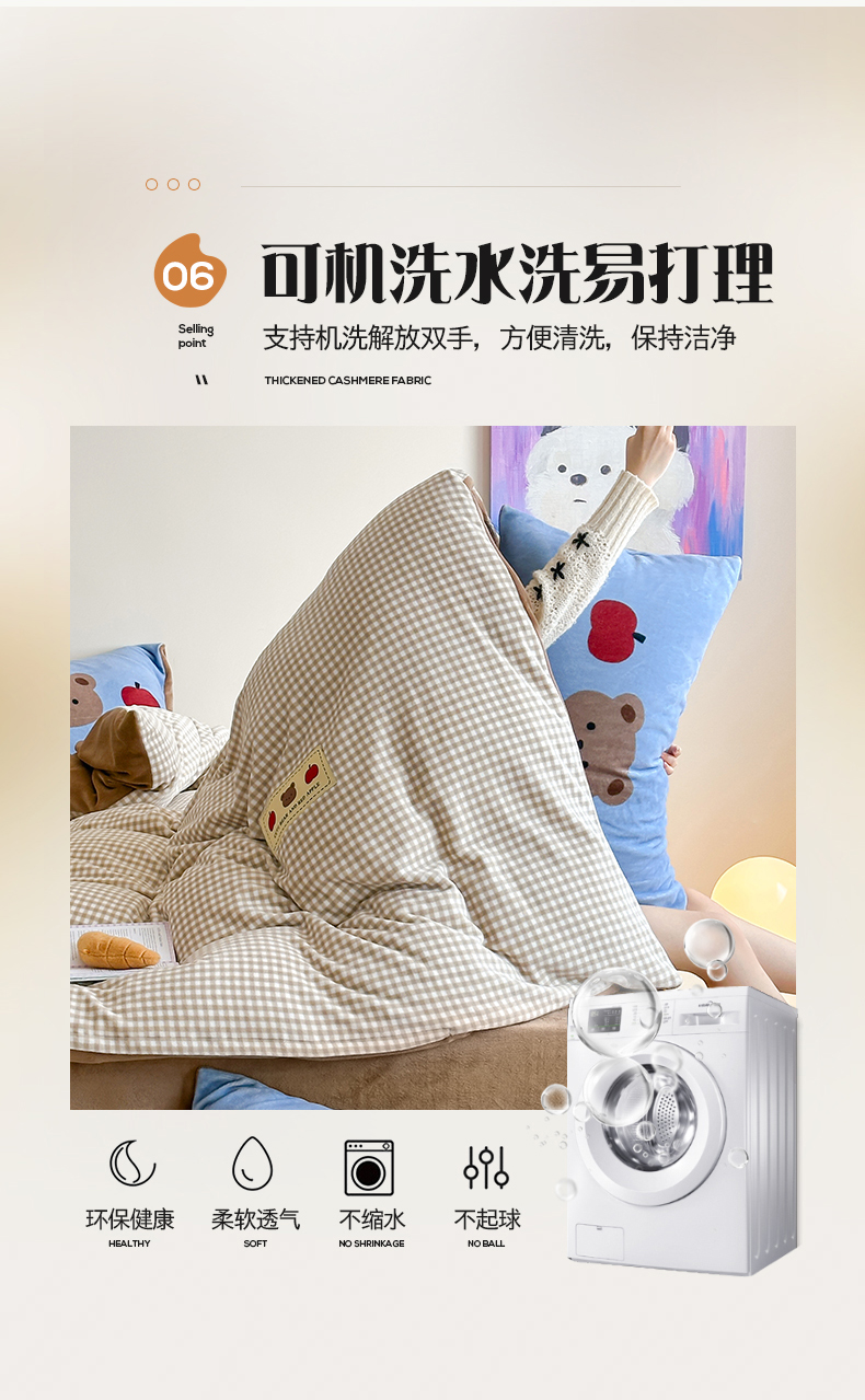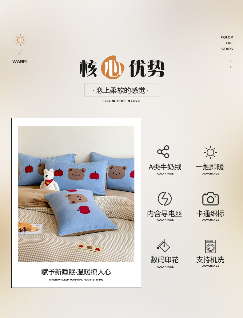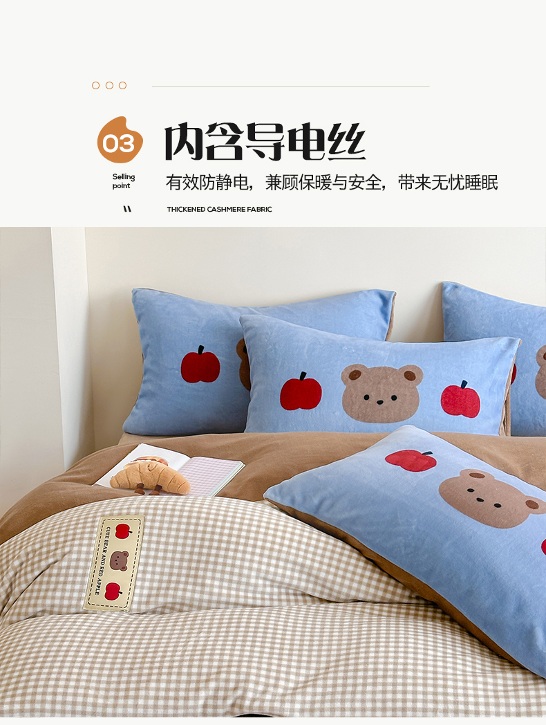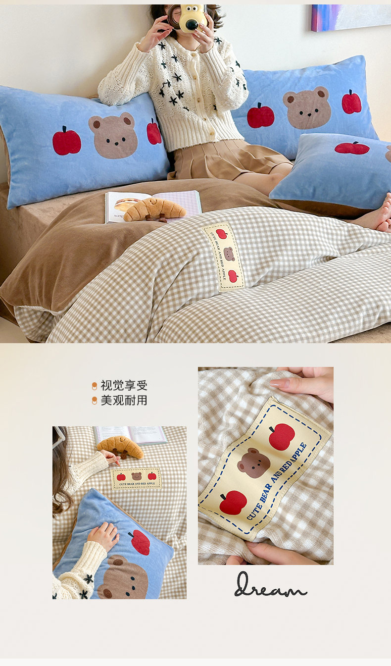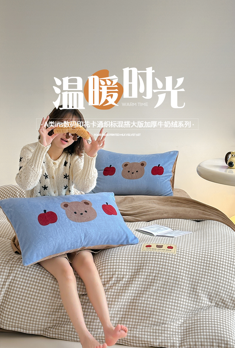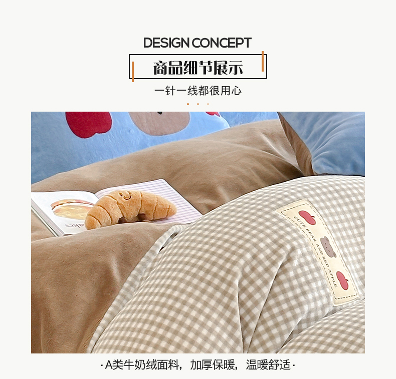 商品名称:桃子家居 2025新款A类ins数码印花卡通织标混搭大版加厚牛奶绒系列四件套 绒-织标咖格苹果熊
