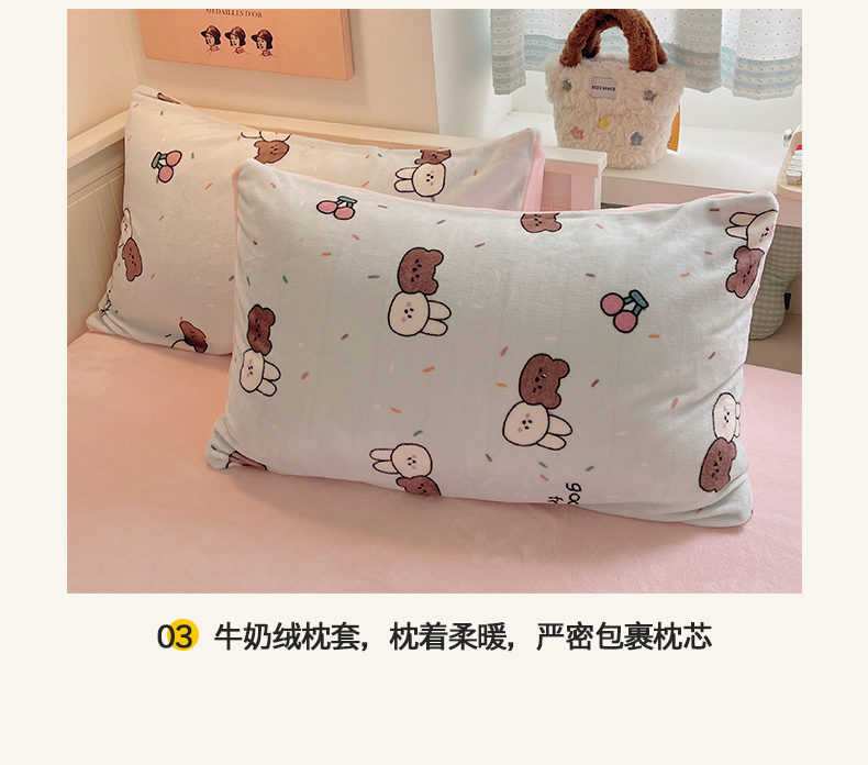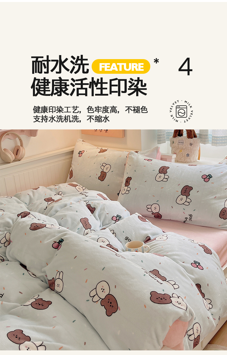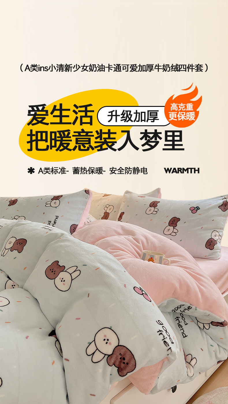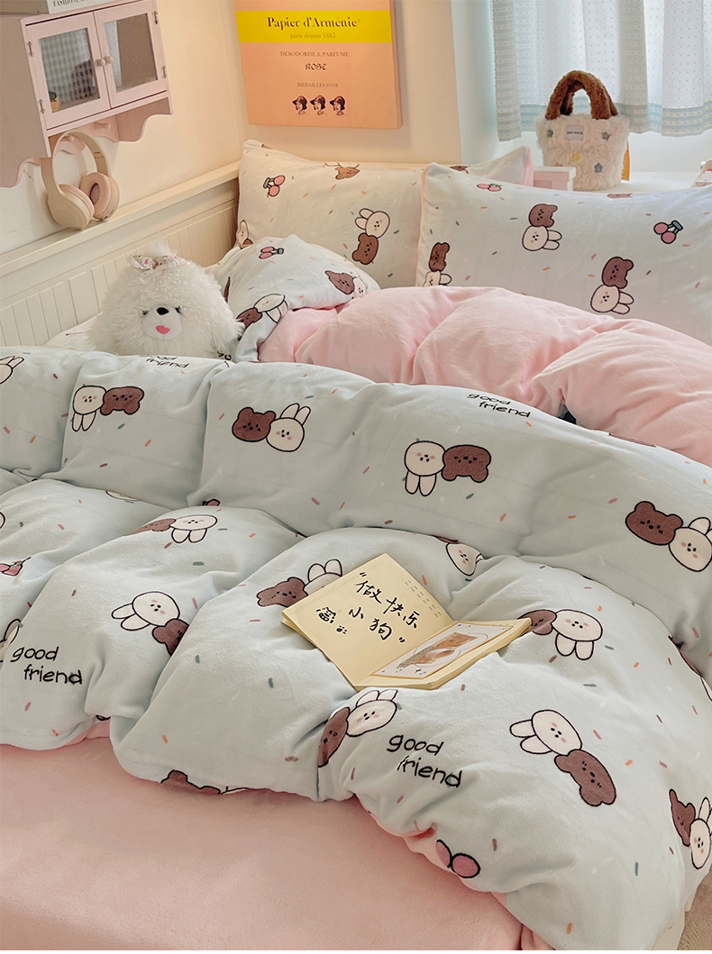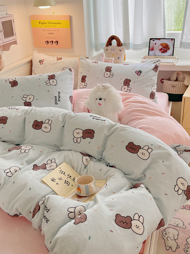 商品名称:金爱家 2025新款A类ins小清新少女奶油卡通可爱加厚牛奶绒四件套 绒-蓝色熊兔