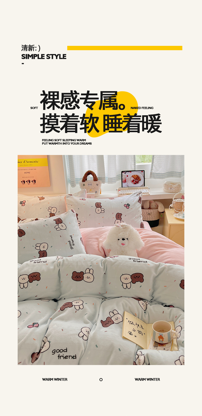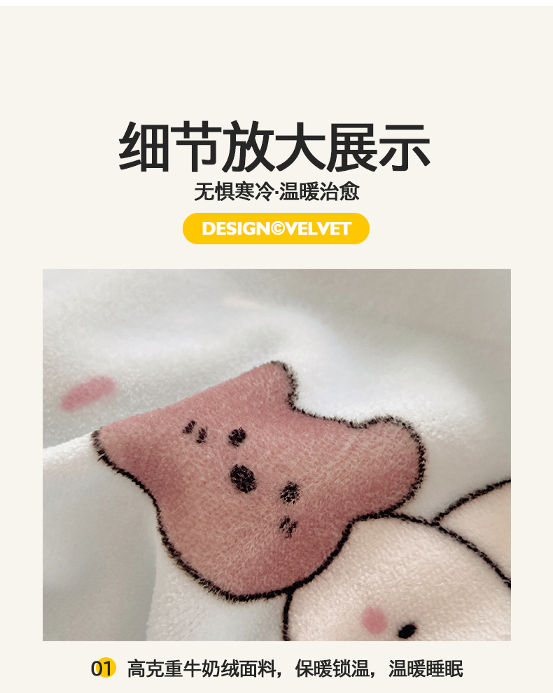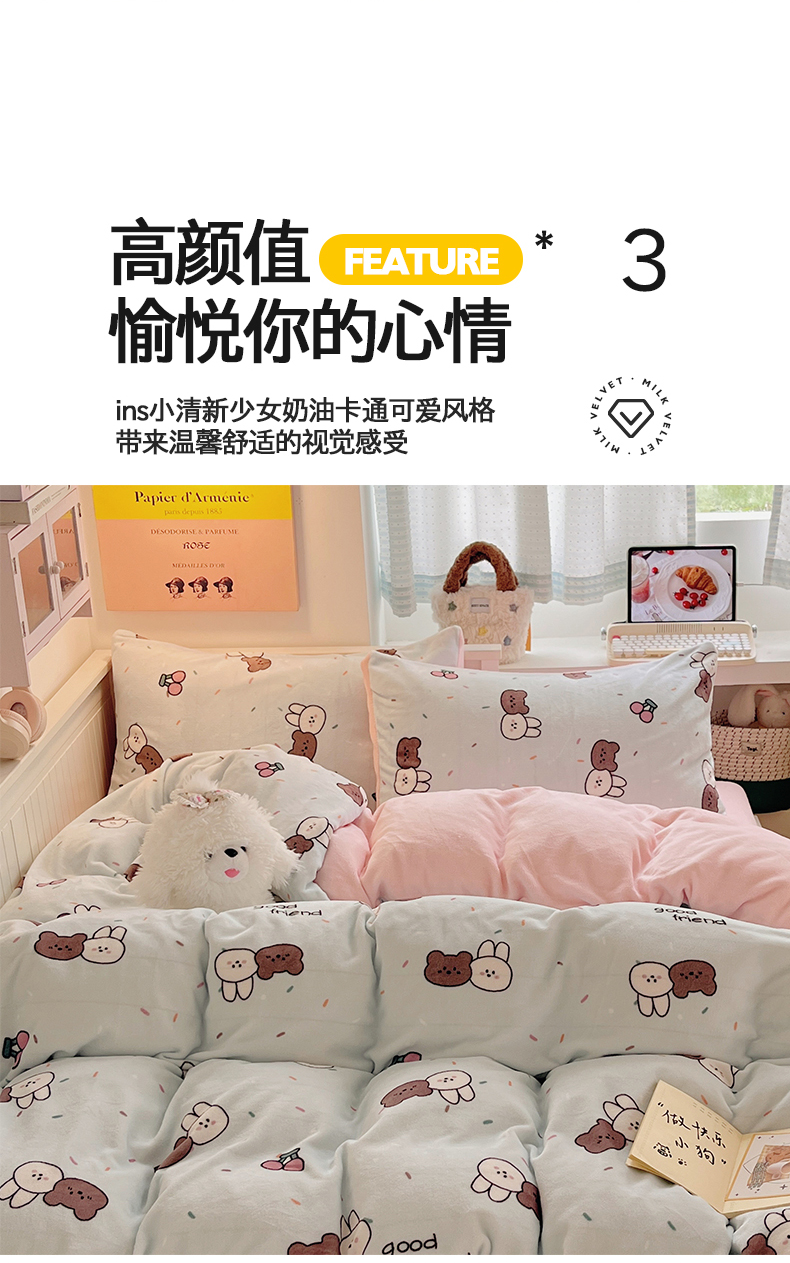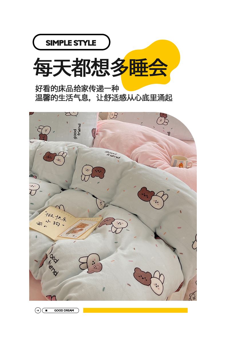 商品名称:金爱家 2025新款A类ins小清新少女奶油卡通可爱加厚牛奶绒四件套 绒-蓝色熊兔