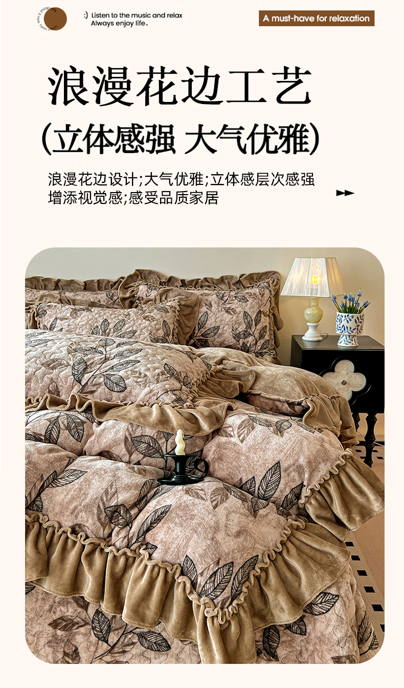 商品名称:鹿辉家居(原吉欧力) 2025新款牛奶绒赫本风夹棉床盖四件套 圈点-咖