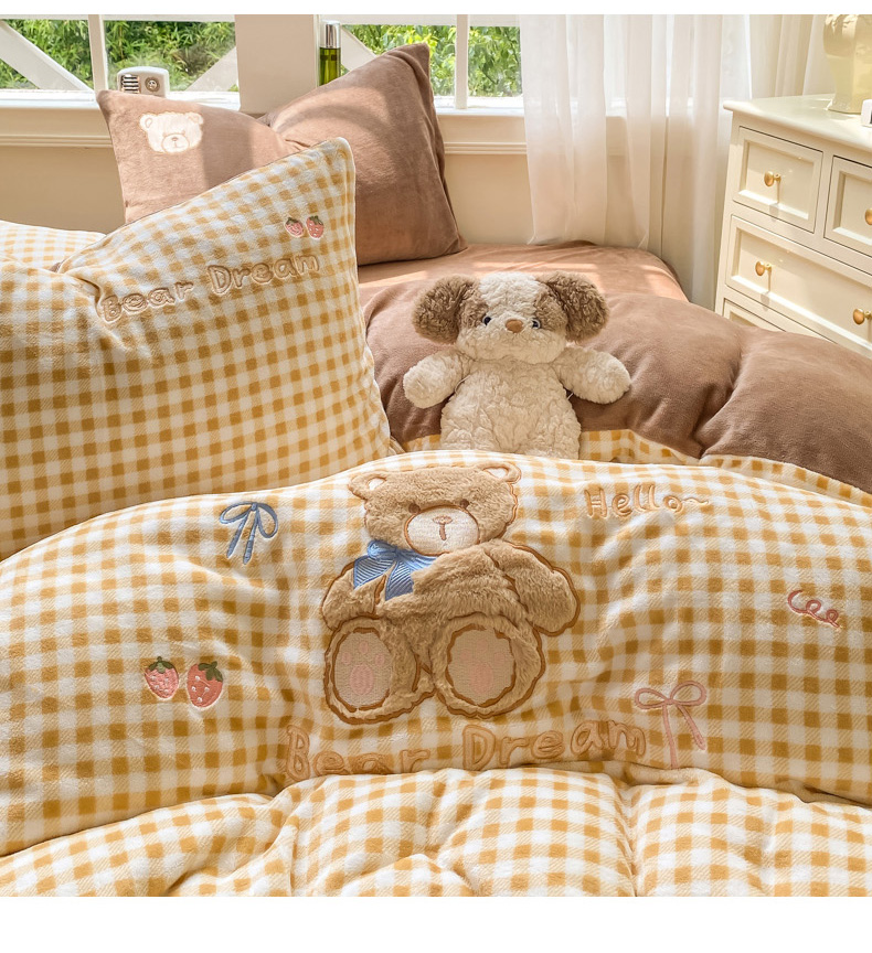 (总)雨帆家纺 2025新款可爱卡通牛奶绒贴布绣四件套,粉格小猫,黄格+咖小熊,蓝格西高地,奶粉小猫,奶咖小熊,奶油蓝西高地