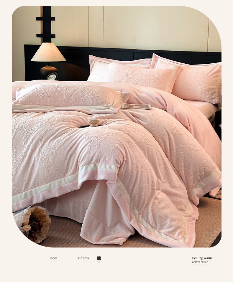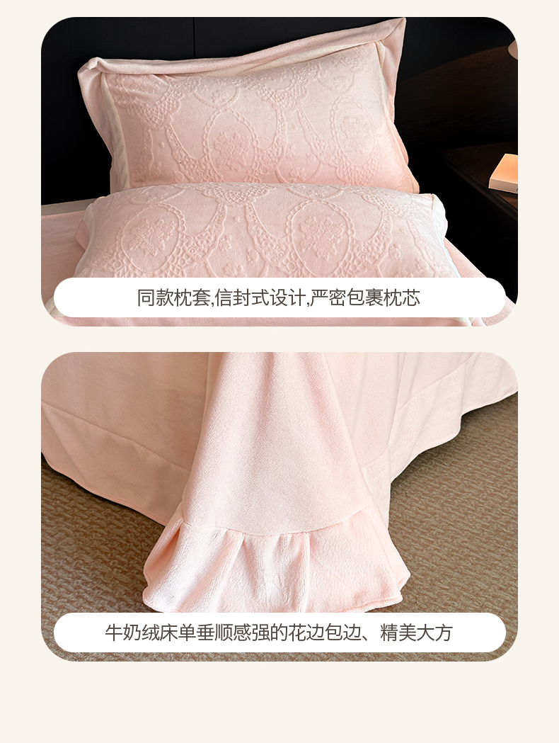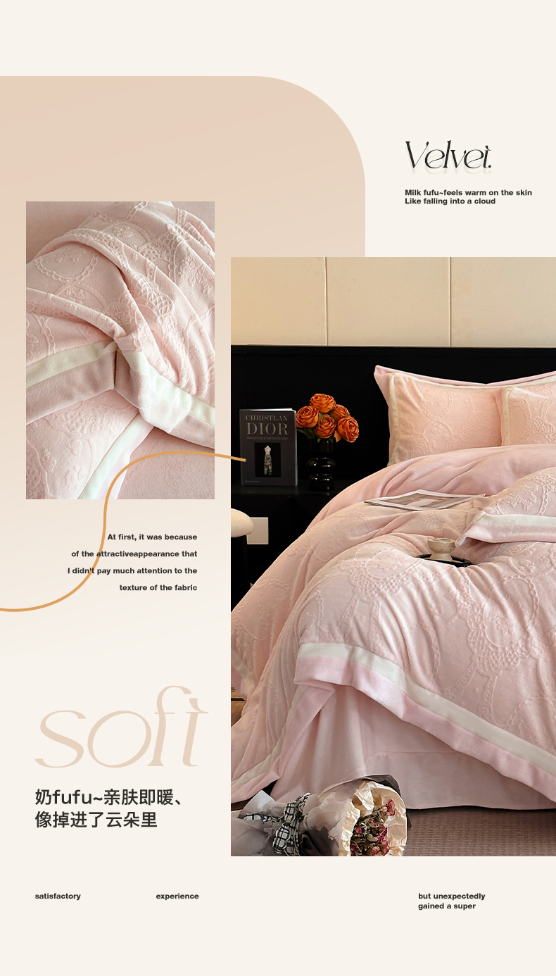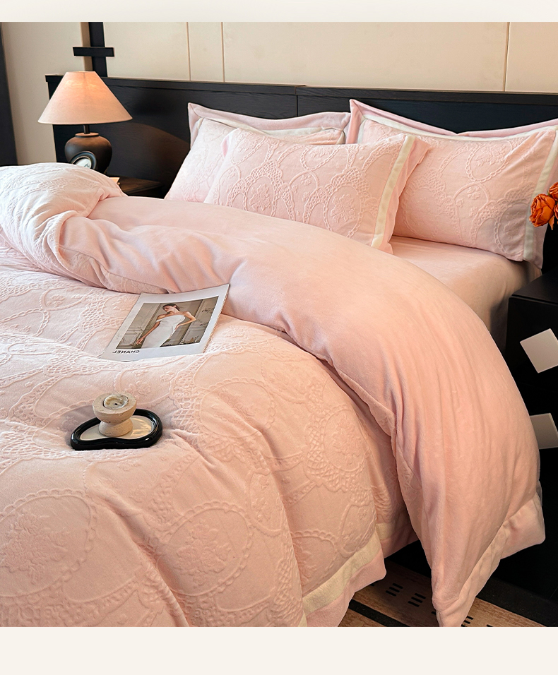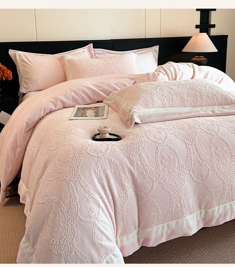 绘萱家居 2025新品热款高密消光双拼边雕花牛奶绒四件套拼角纯色 洛娜-粉