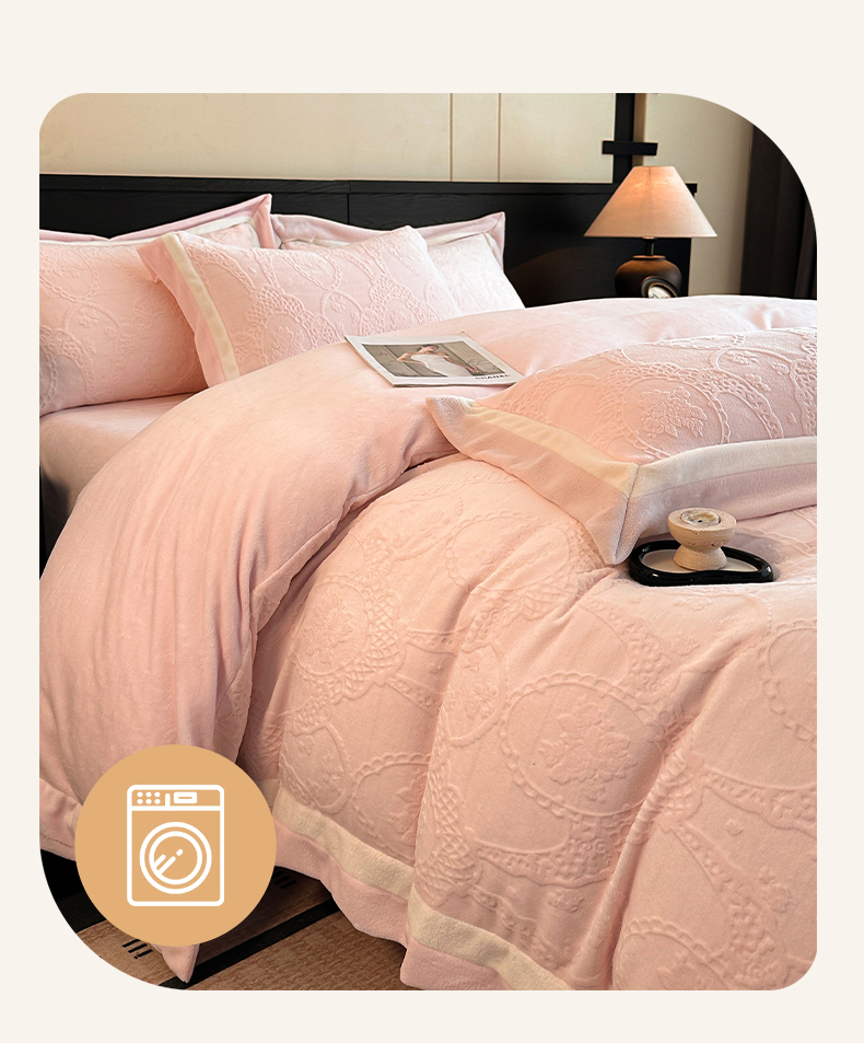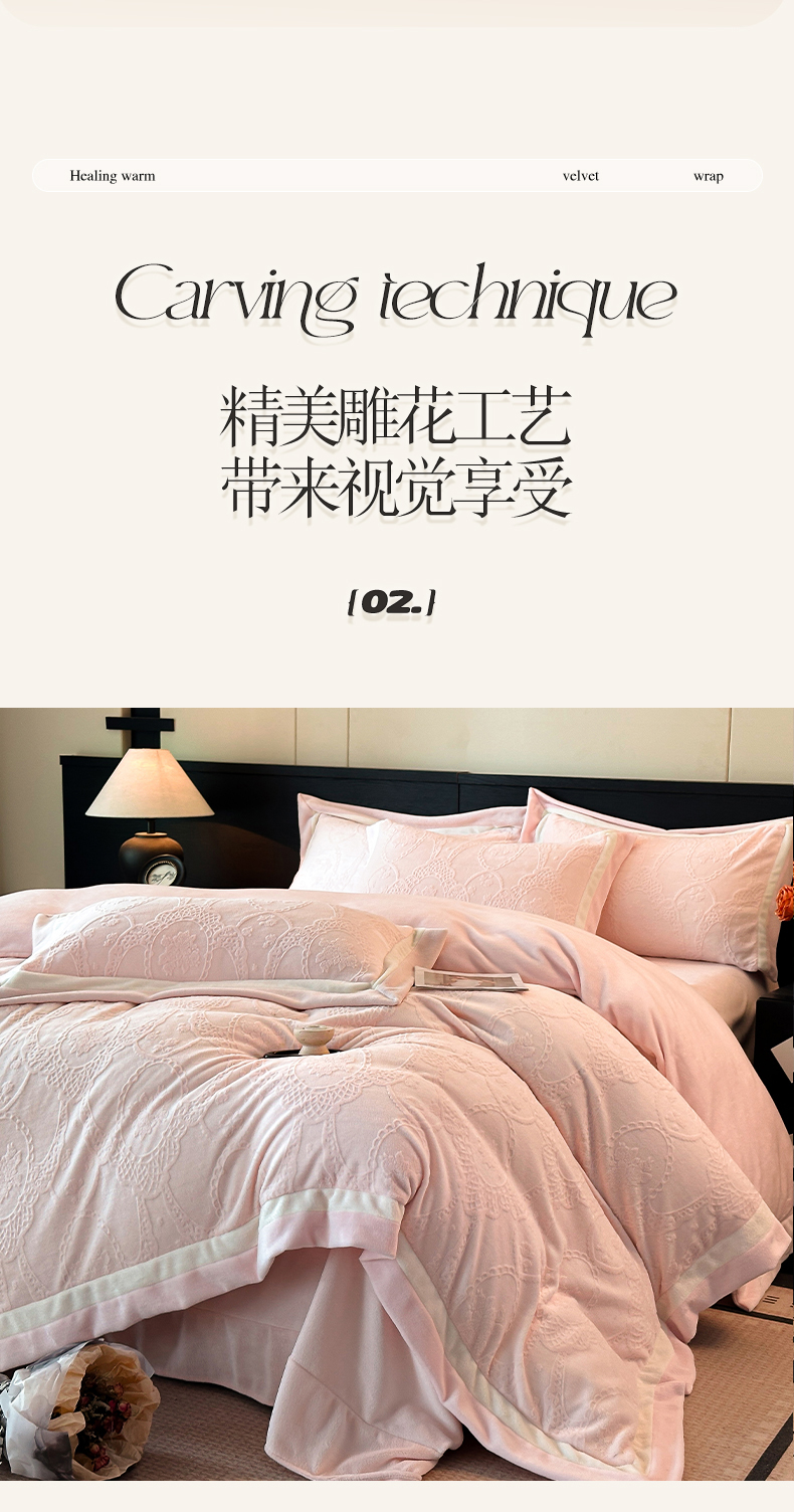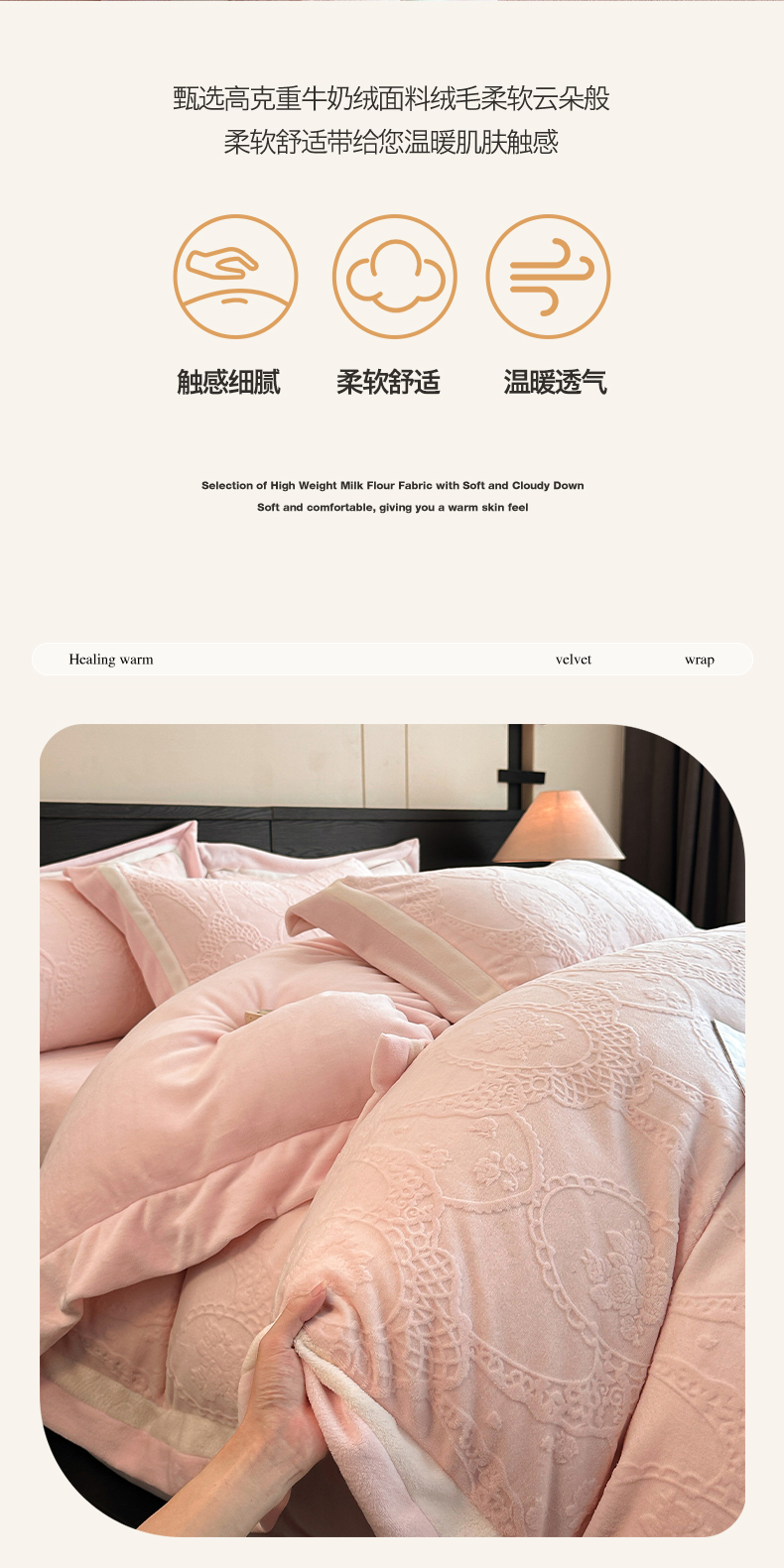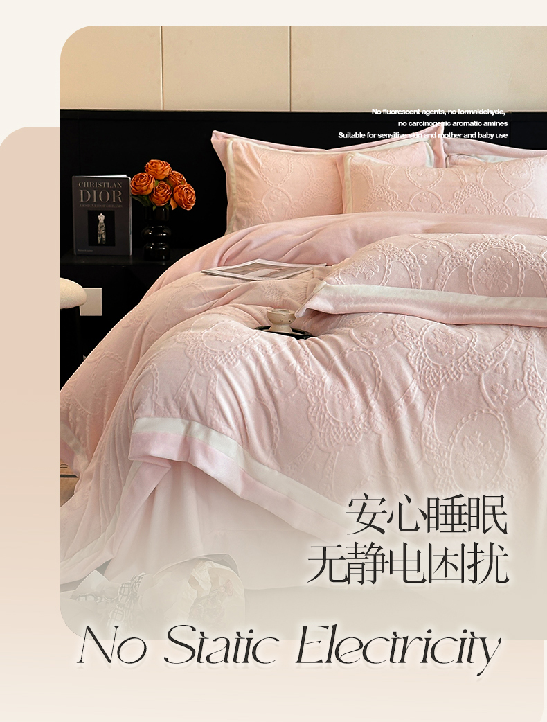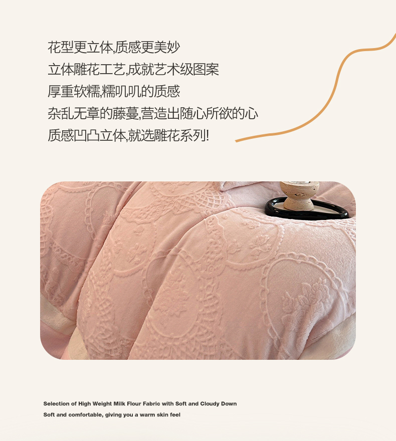 绘萱家居 2025新品热款高密消光双拼边雕花牛奶绒四件套拼角纯色 洛娜-粉