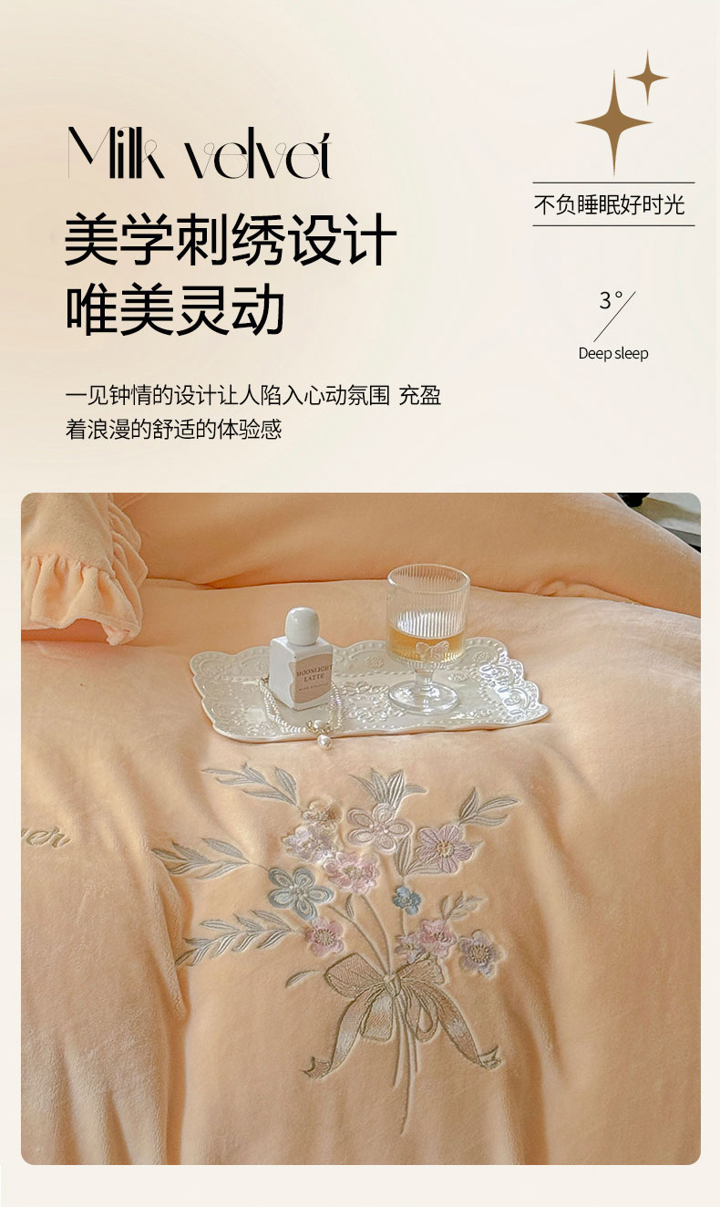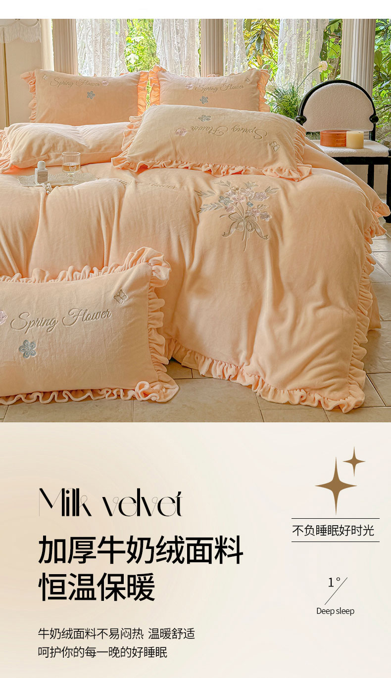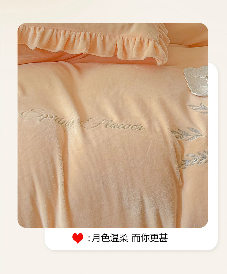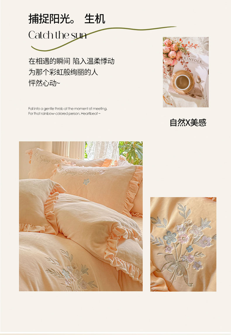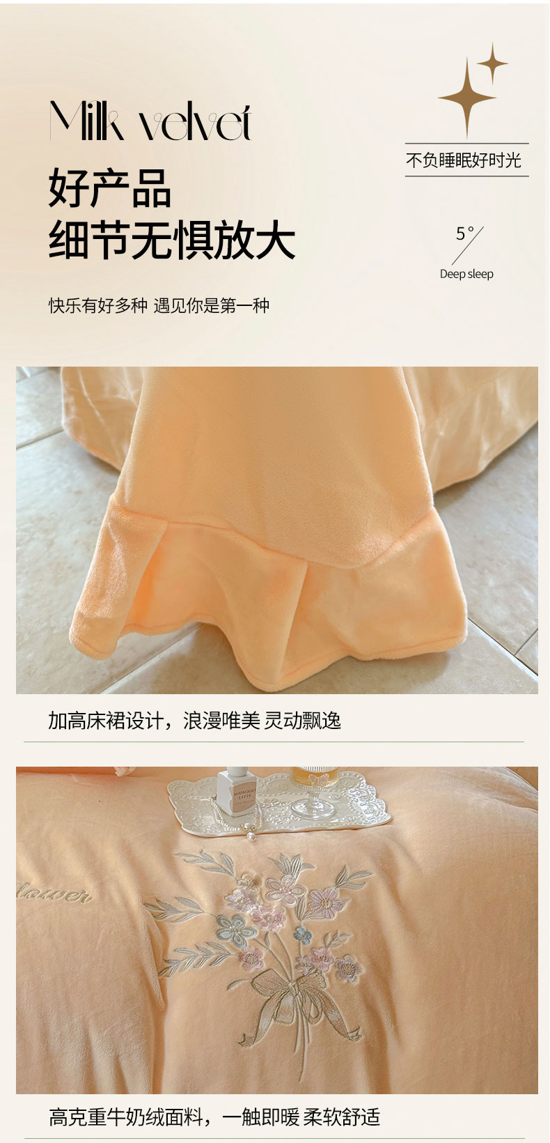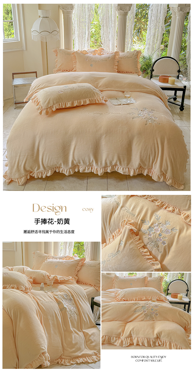 商品名称:美洲琳 2025新款高克重牛奶绒绣花四件套 手捧花-奶黄
