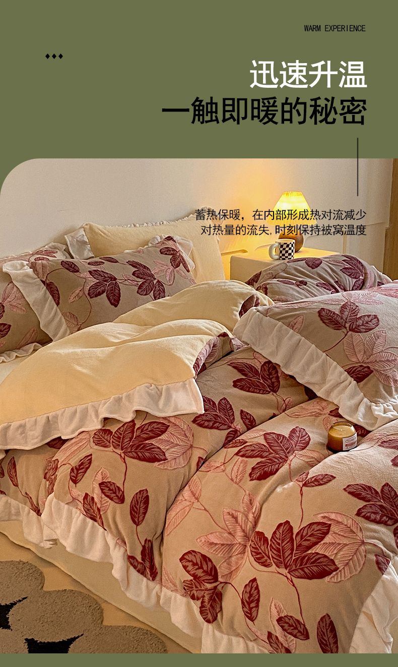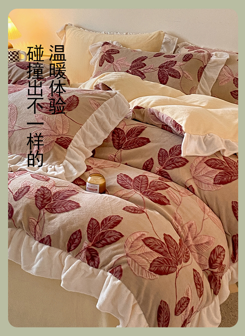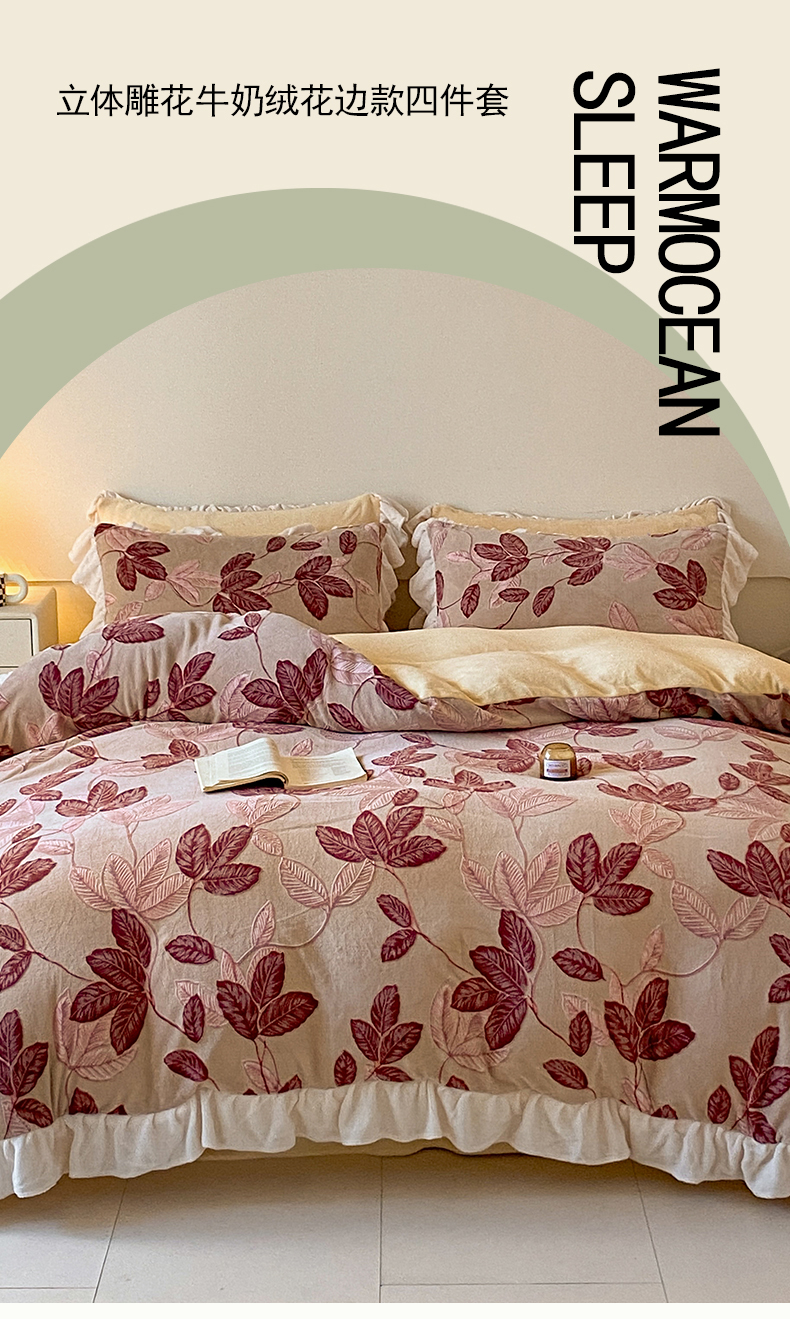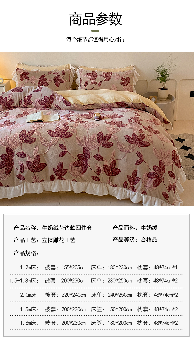 当前位置: 91家纺网 > 商品网购 > 床品套件 > 四件套 > 牛奶绒四件套 > 琪格格纺织 2025新款全消光小清新花边款雕花牛奶绒四件套 雕花花边-秋色宜人酒红