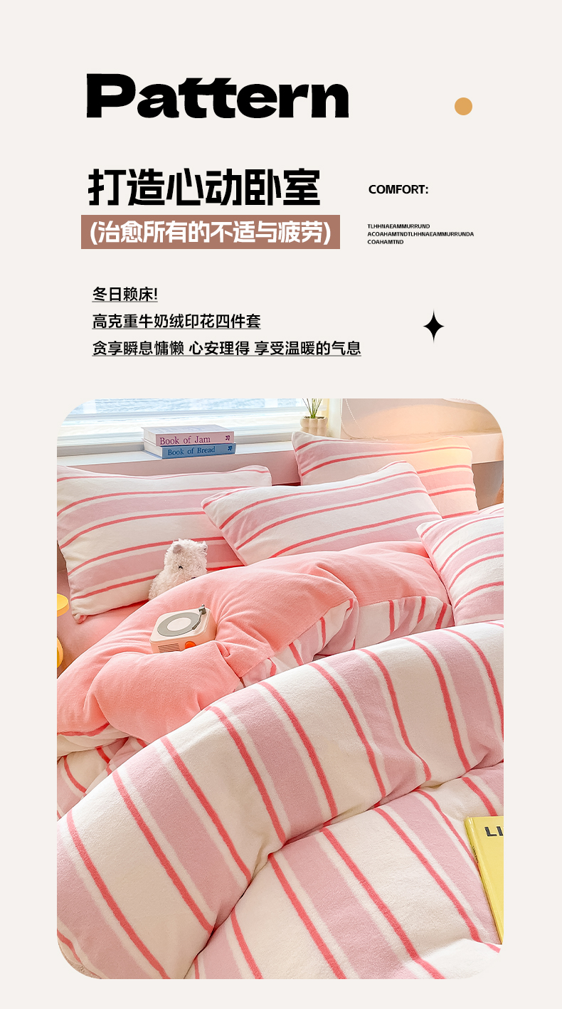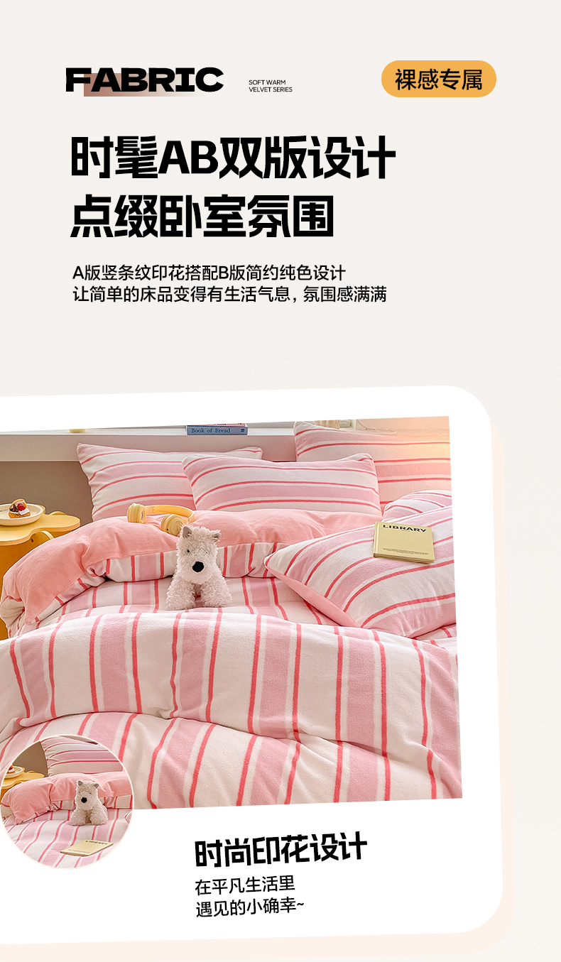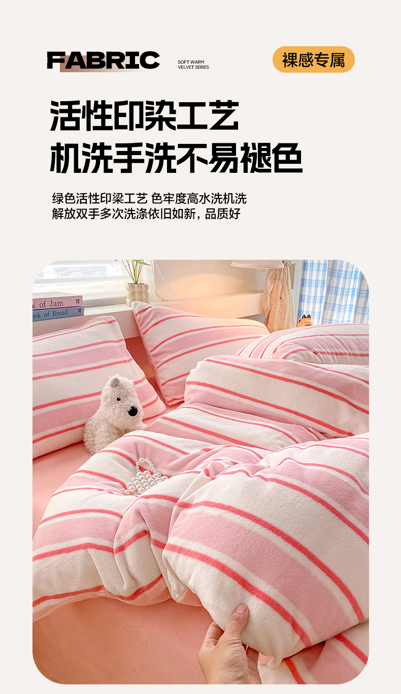 商品名称:雅居纺家纺 2025新款高克重牛奶绒印花单被套 粉色竖条
