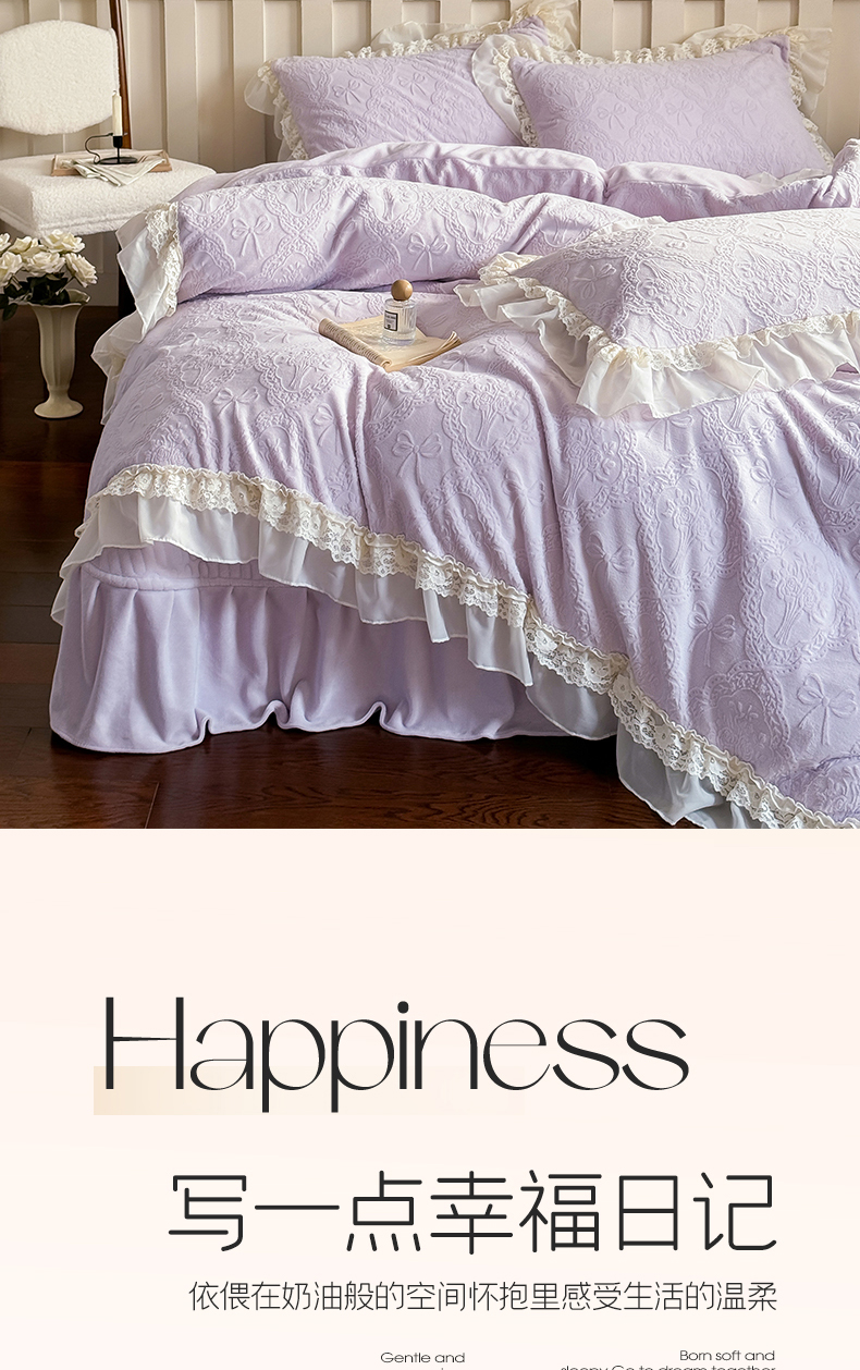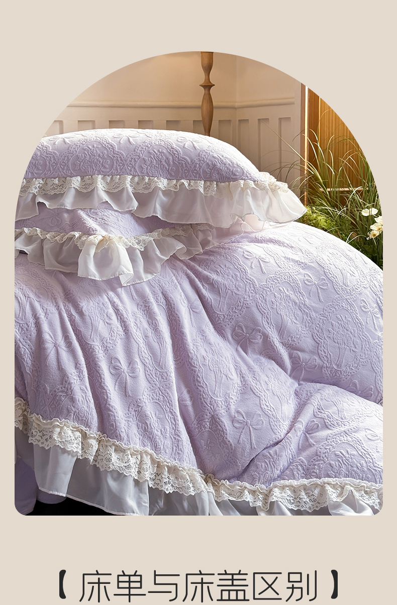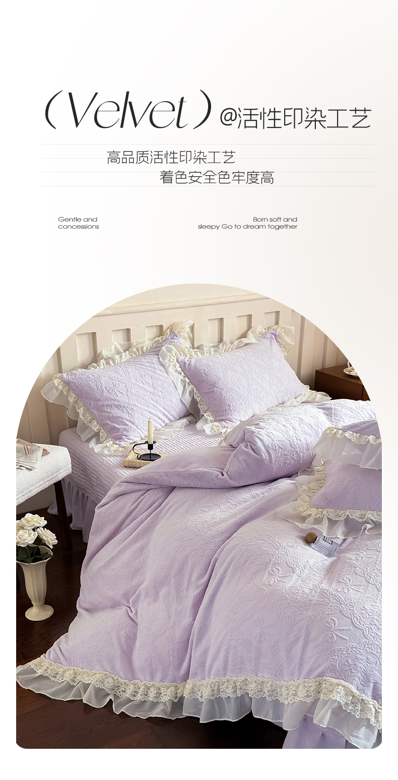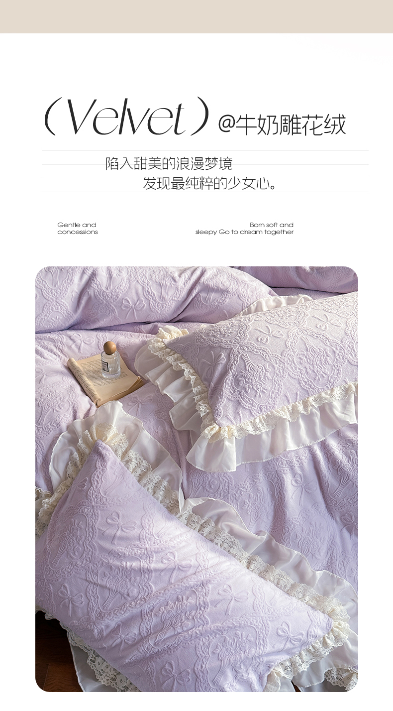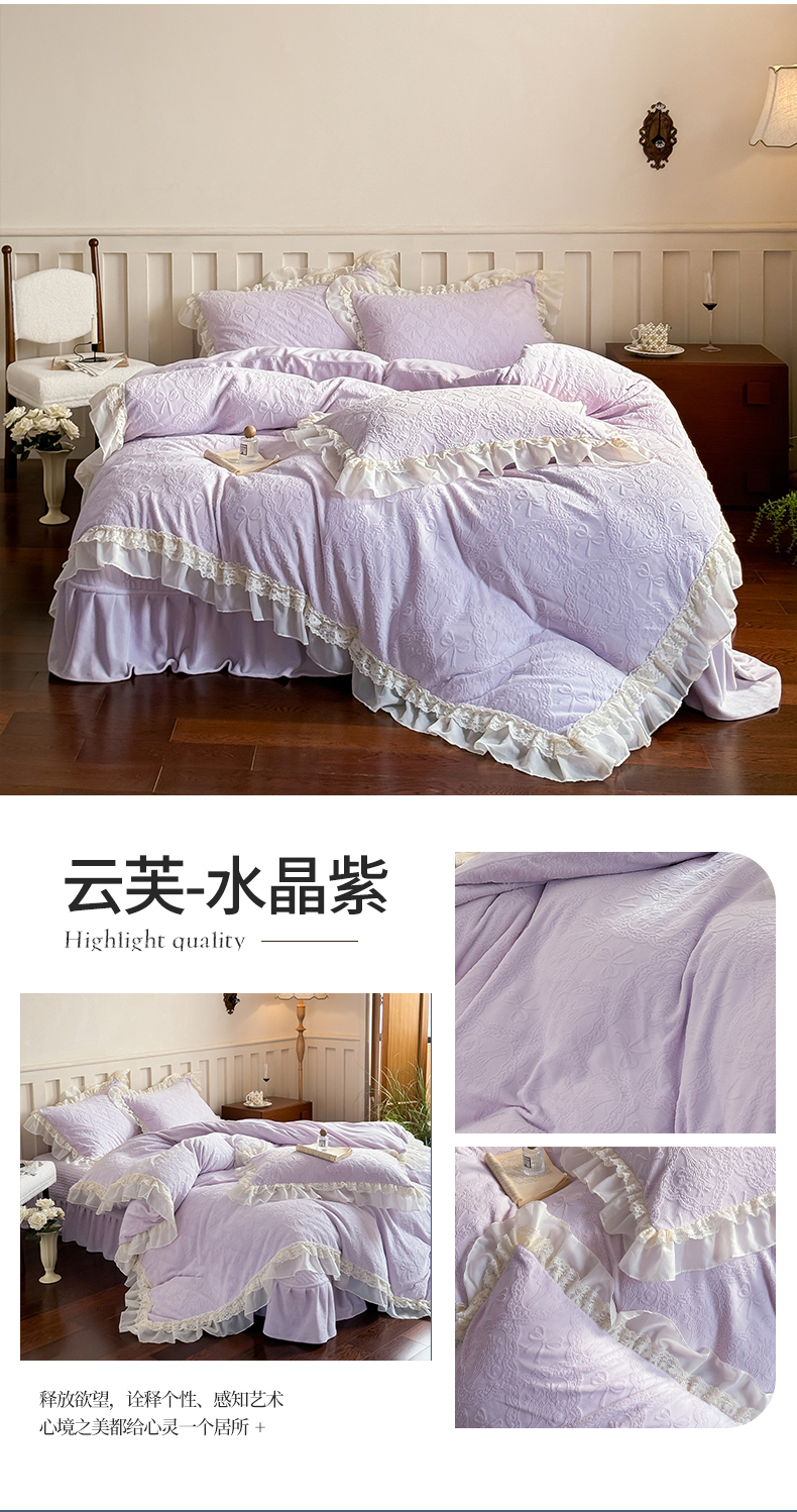 商品名称:满座家居 2025新款爆款全消光牛奶绒雕花四件套蕾丝花边仙女款床盖四件套-云芙 云芙-水晶紫