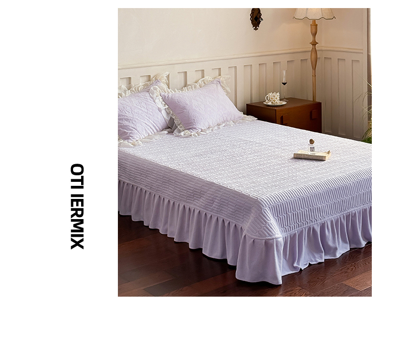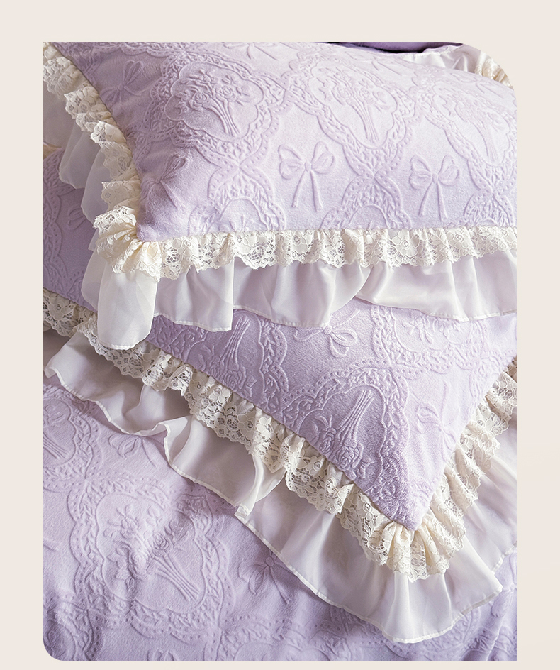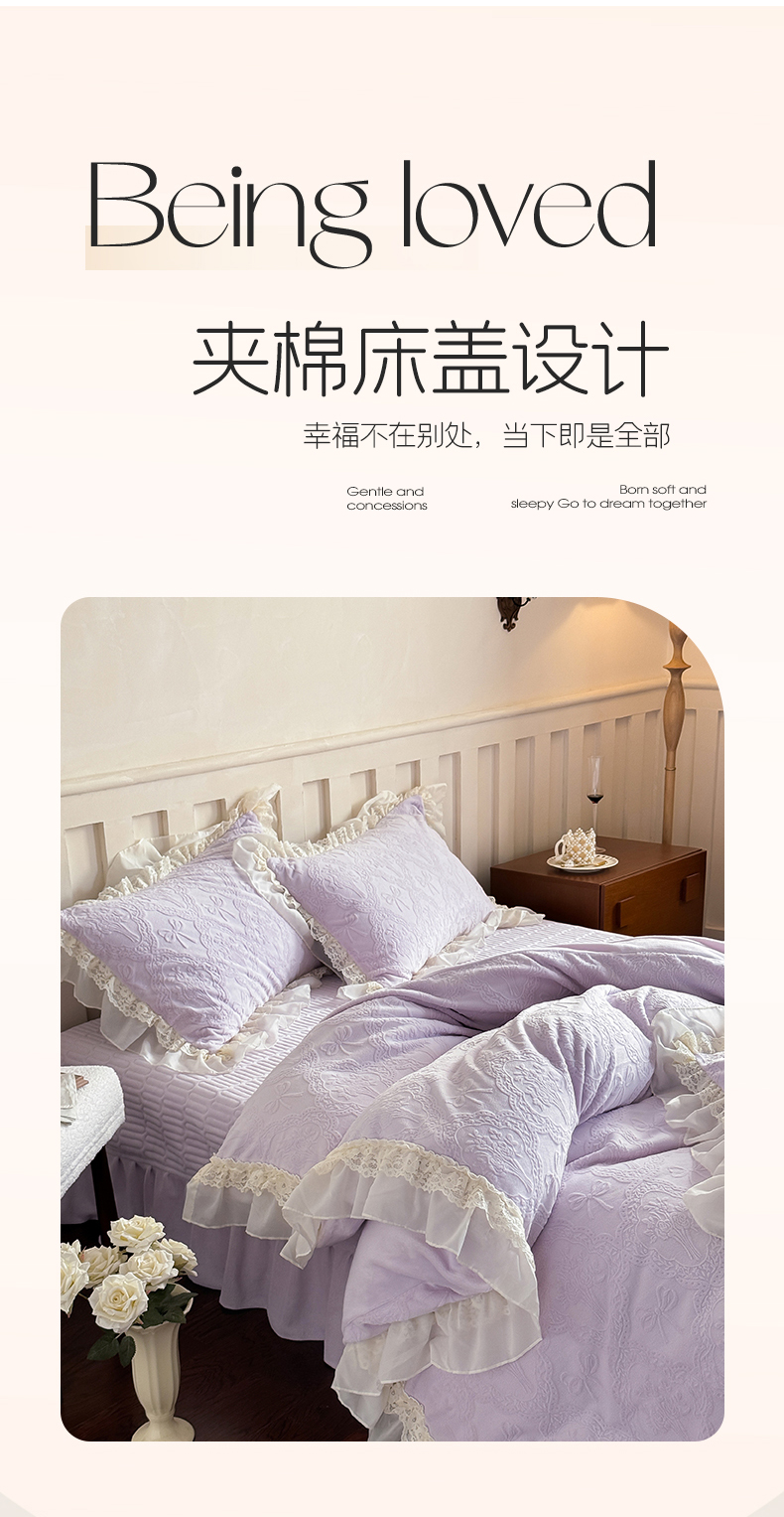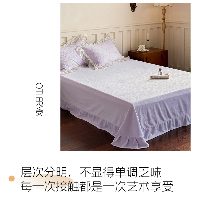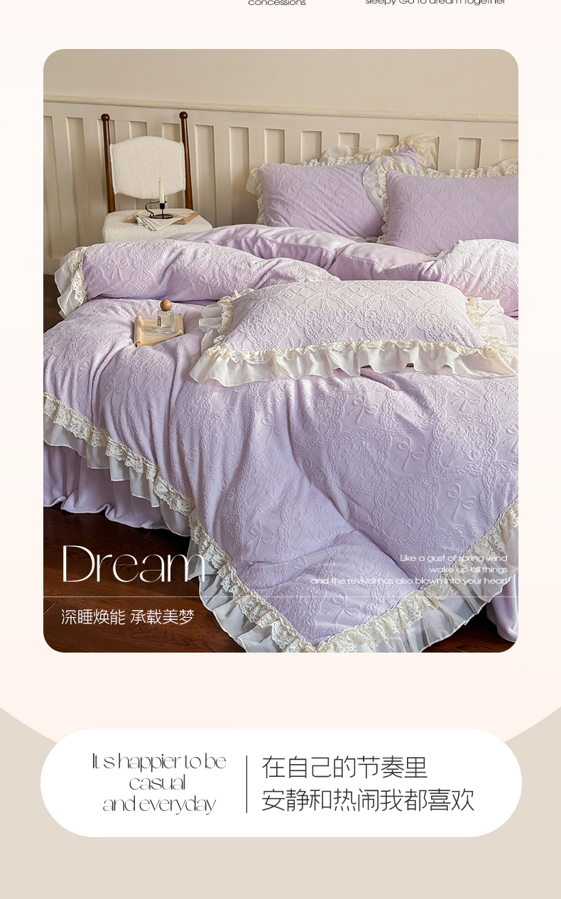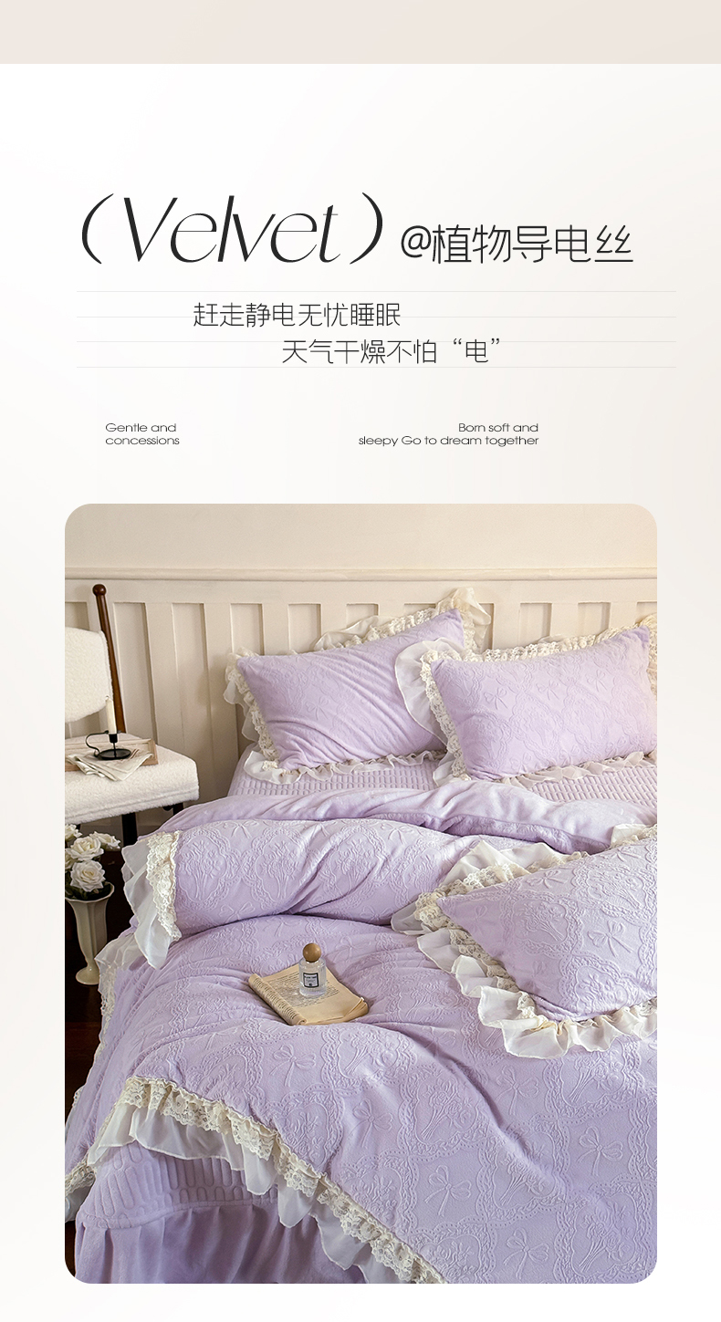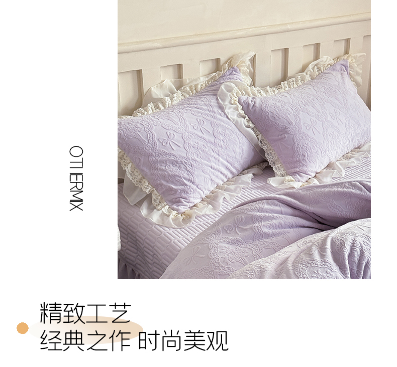 商品名称:满座家居 2025新款爆款全消光牛奶绒雕花四件套蕾丝花边仙女款床盖四件套-云芙 云芙-水晶紫