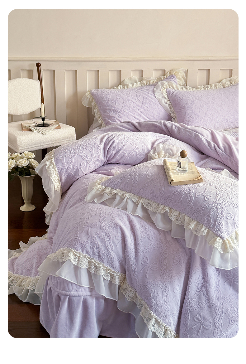 满座家居 2025新款爆款全消光牛奶绒雕花四件套蕾丝花边仙女款床盖四件套-云芙 云芙-水晶紫