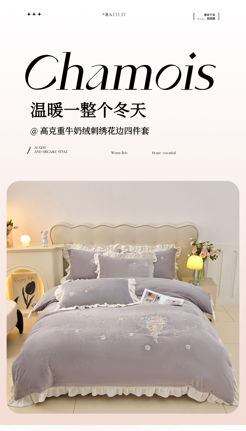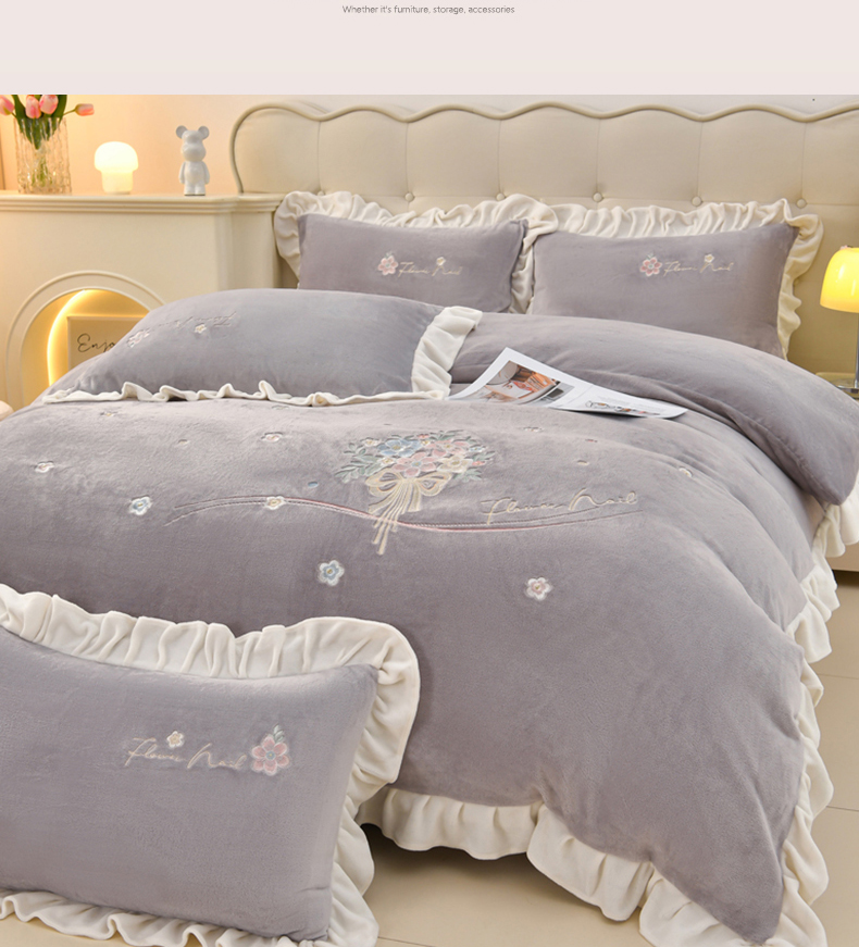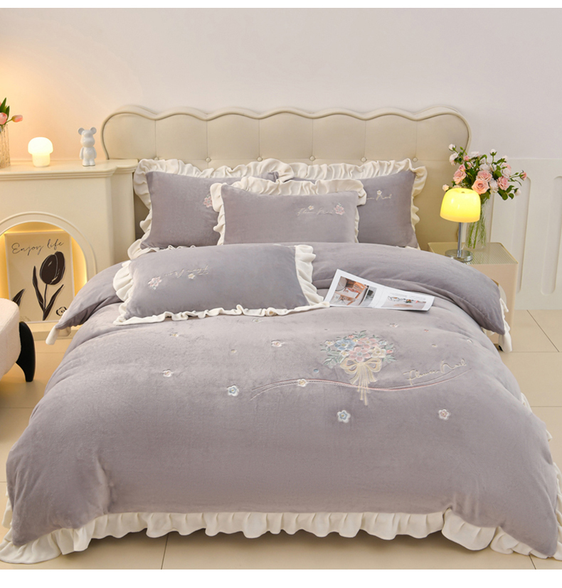 畅畅家纺 2025新款亲肤舒适冬季刺绣花边保暖牛奶绒四件套-花束 花束-灰