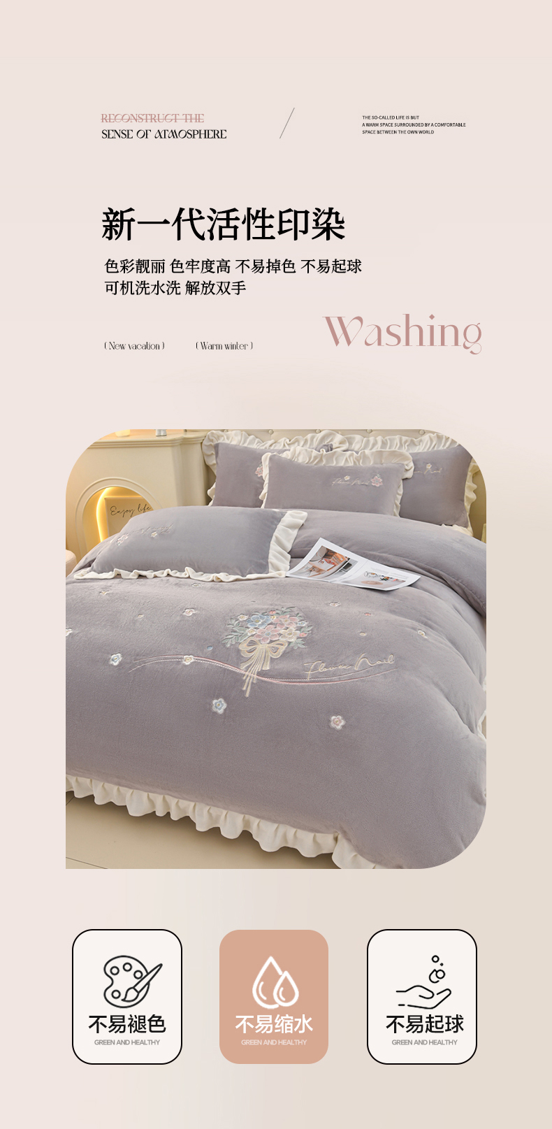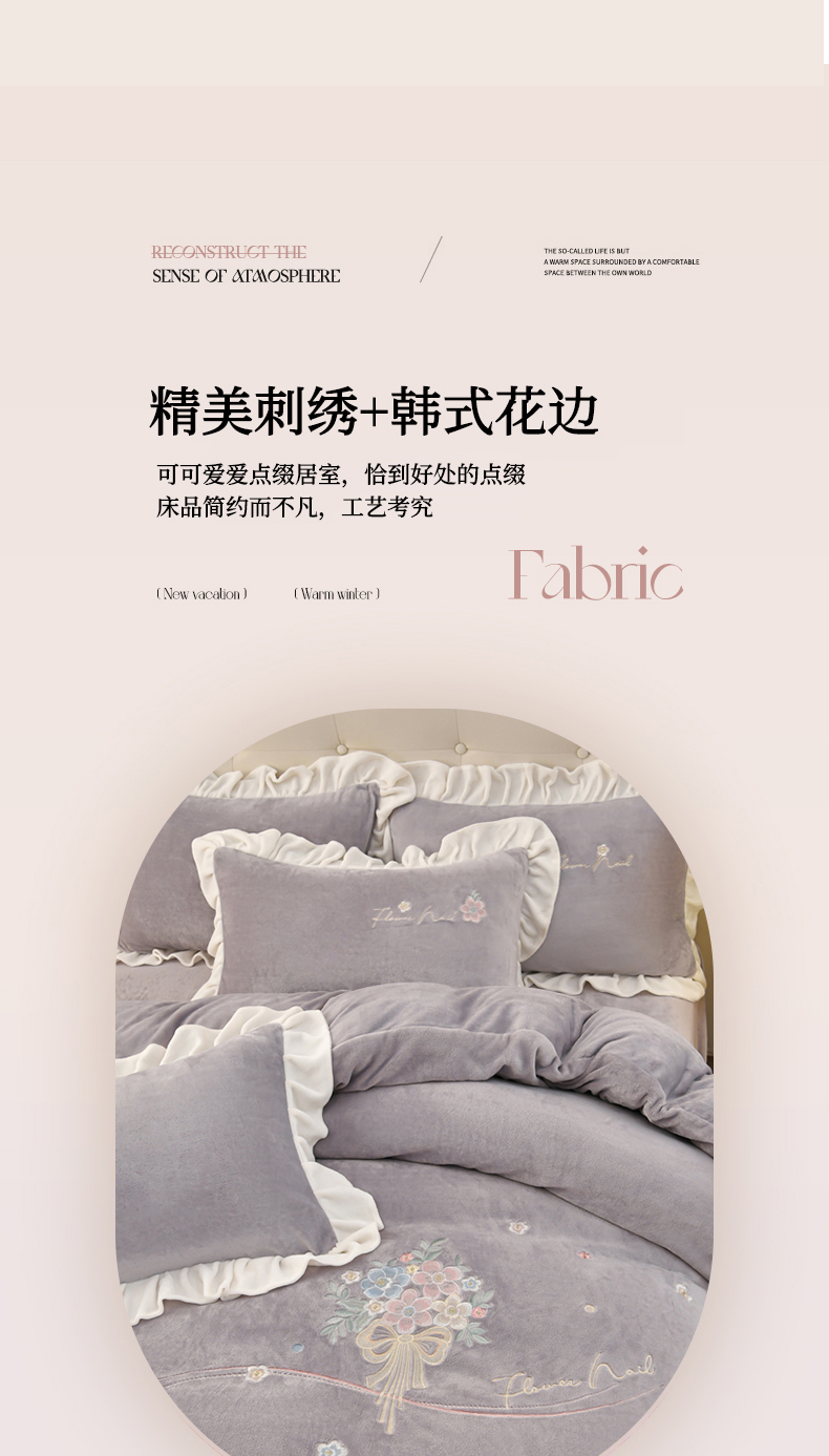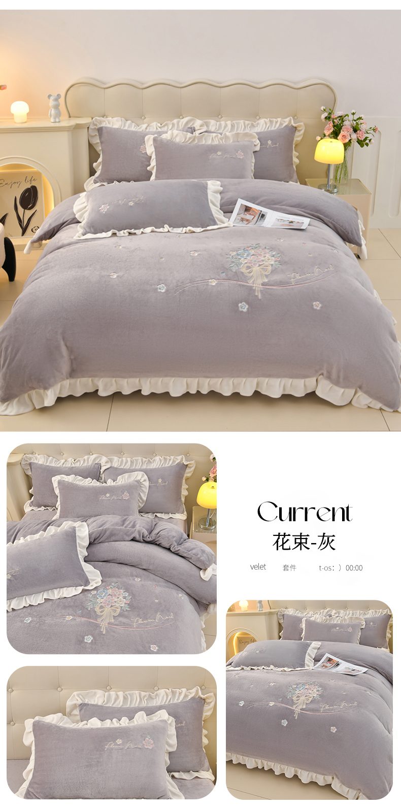 商品名称:畅畅家纺 2025新款亲肤舒适冬季刺绣花边保暖牛奶绒四件套-花束 花束-灰