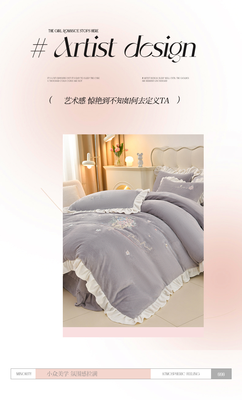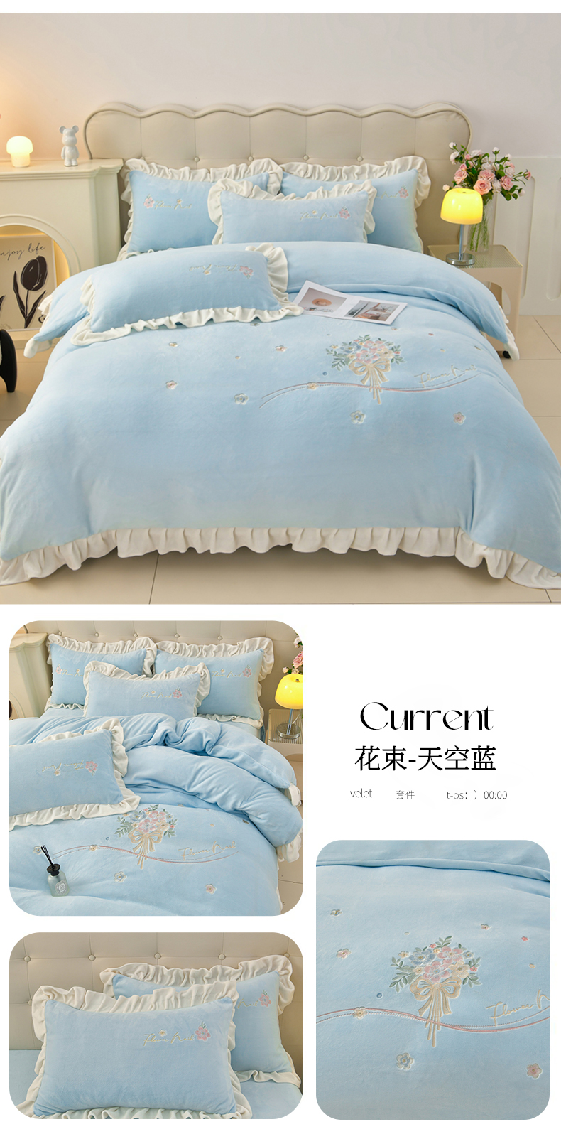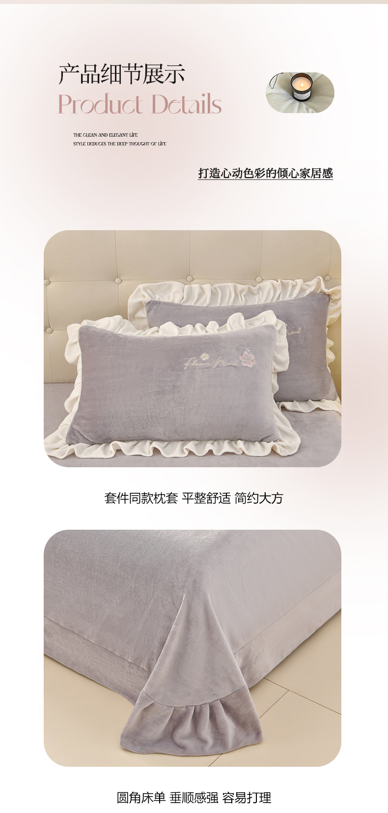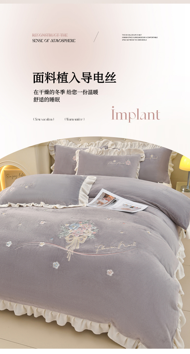 商品名称:畅畅家纺 2025新款亲肤舒适冬季刺绣花边保暖牛奶绒四件套-花束 花束-灰