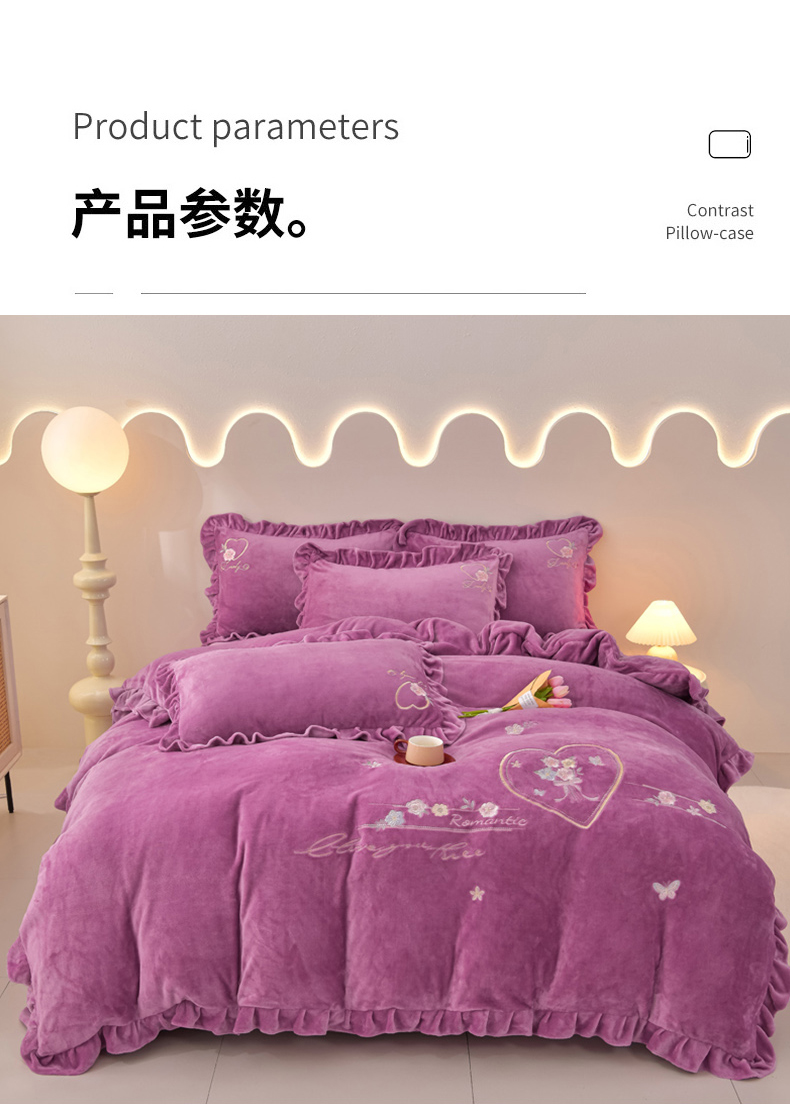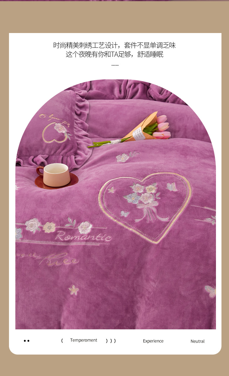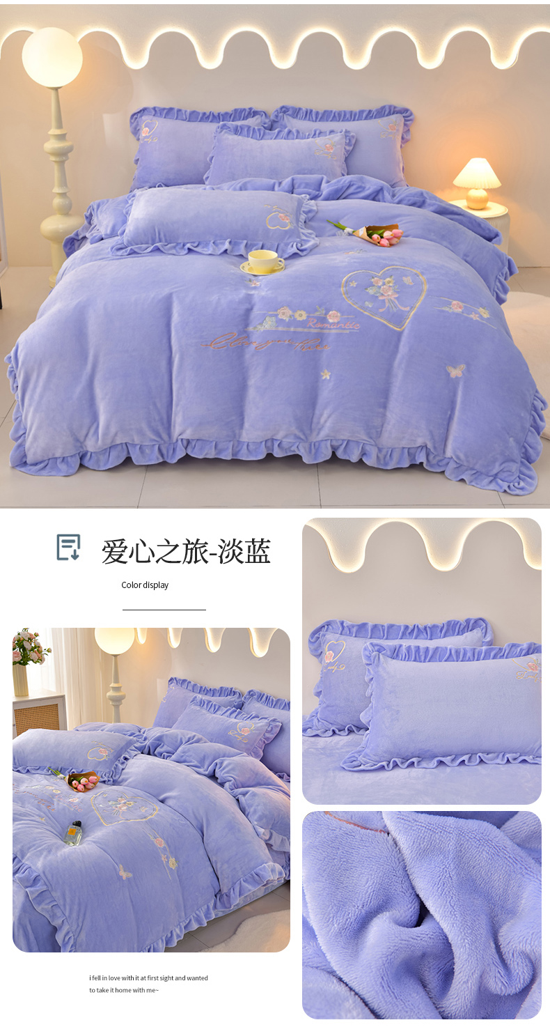 商品名称:畅畅家纺 2025新款亲肤舒适冬季刺绣花边保暖牛奶绒四件套-爱心之旅 爱心之旅-淡紫