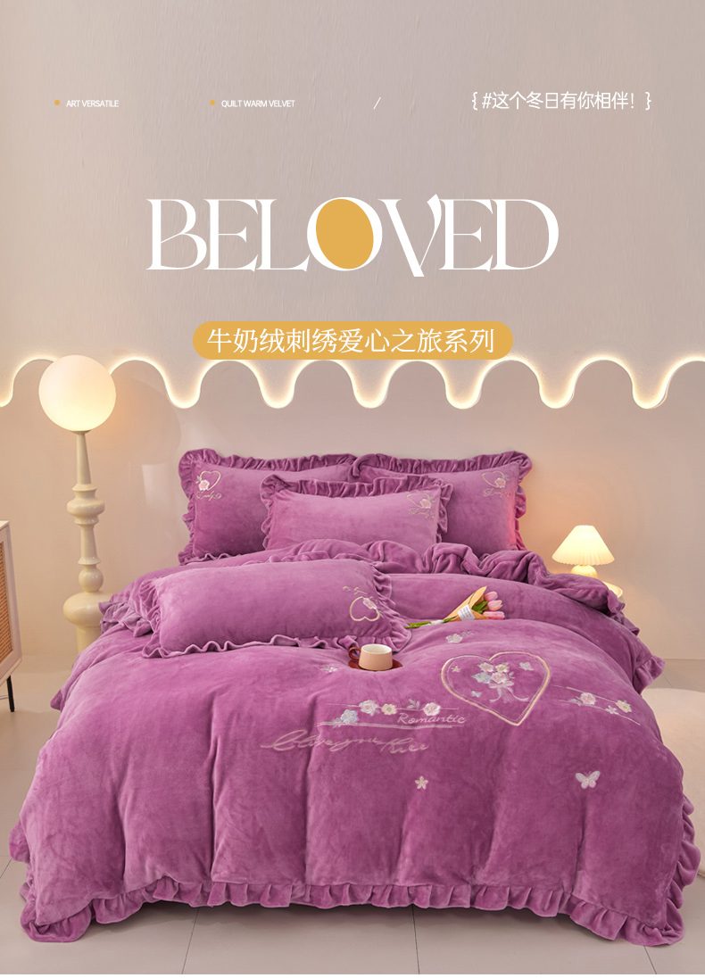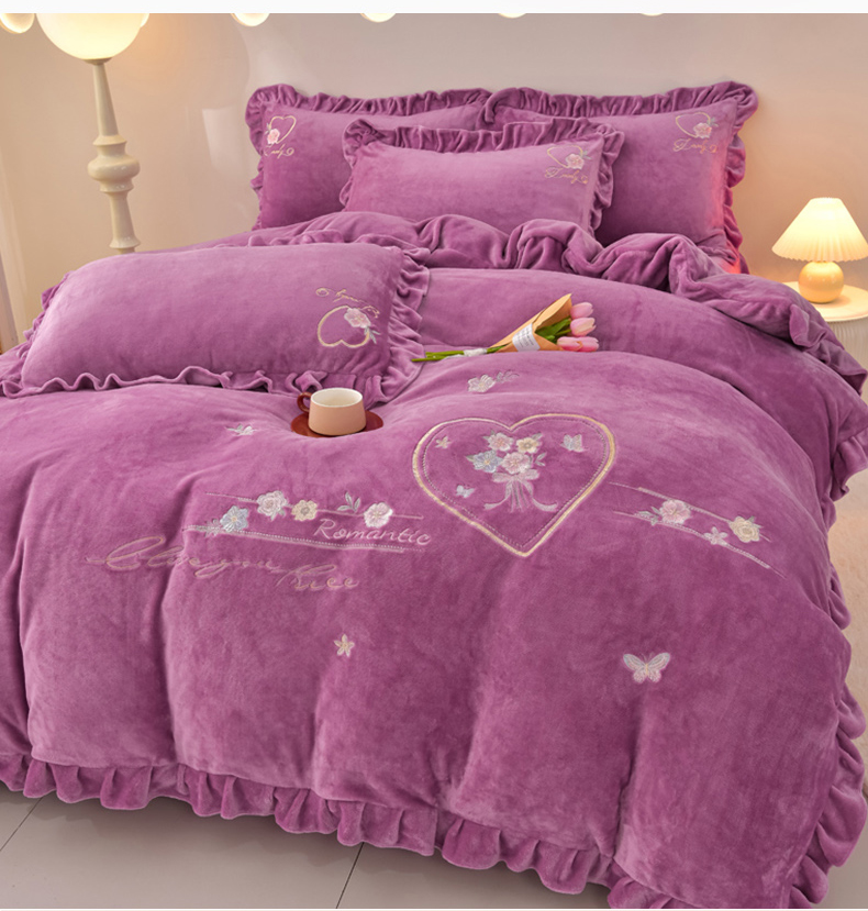畅畅家纺 2025新款亲肤舒适冬季刺绣花边保暖牛奶绒四件套-爱心之旅 爱心之旅-淡紫