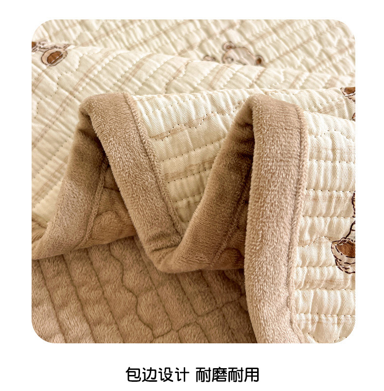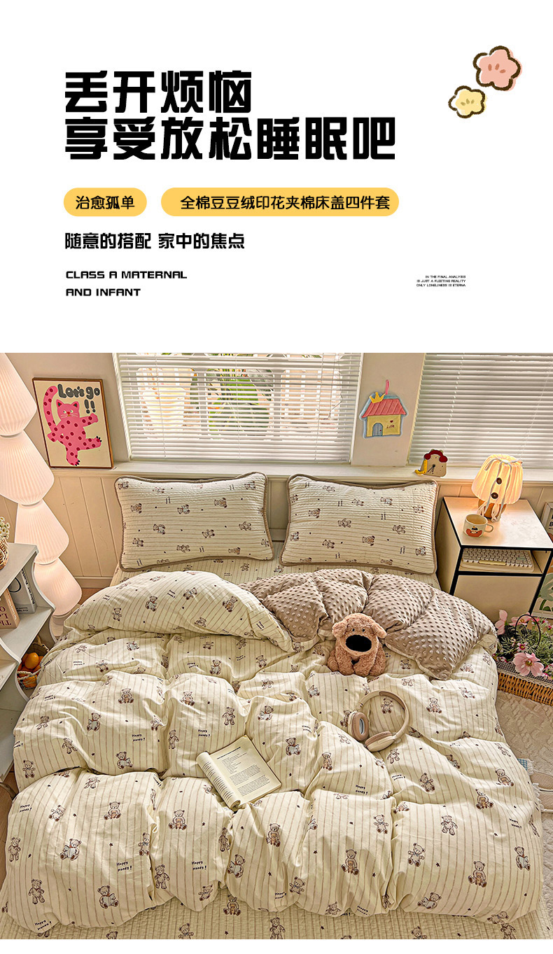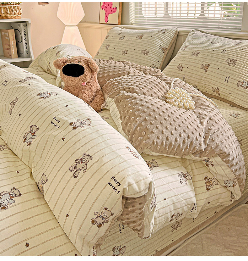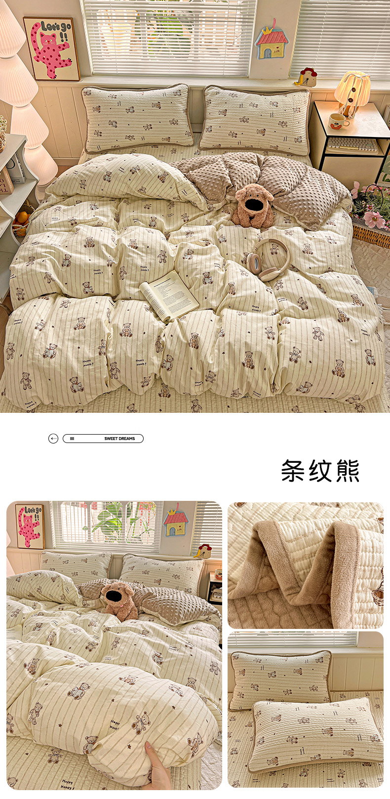 漫时光 2025新款正面纯棉反面宝宝绒印花夹棉砂洗床盖四件套 条纹熊
