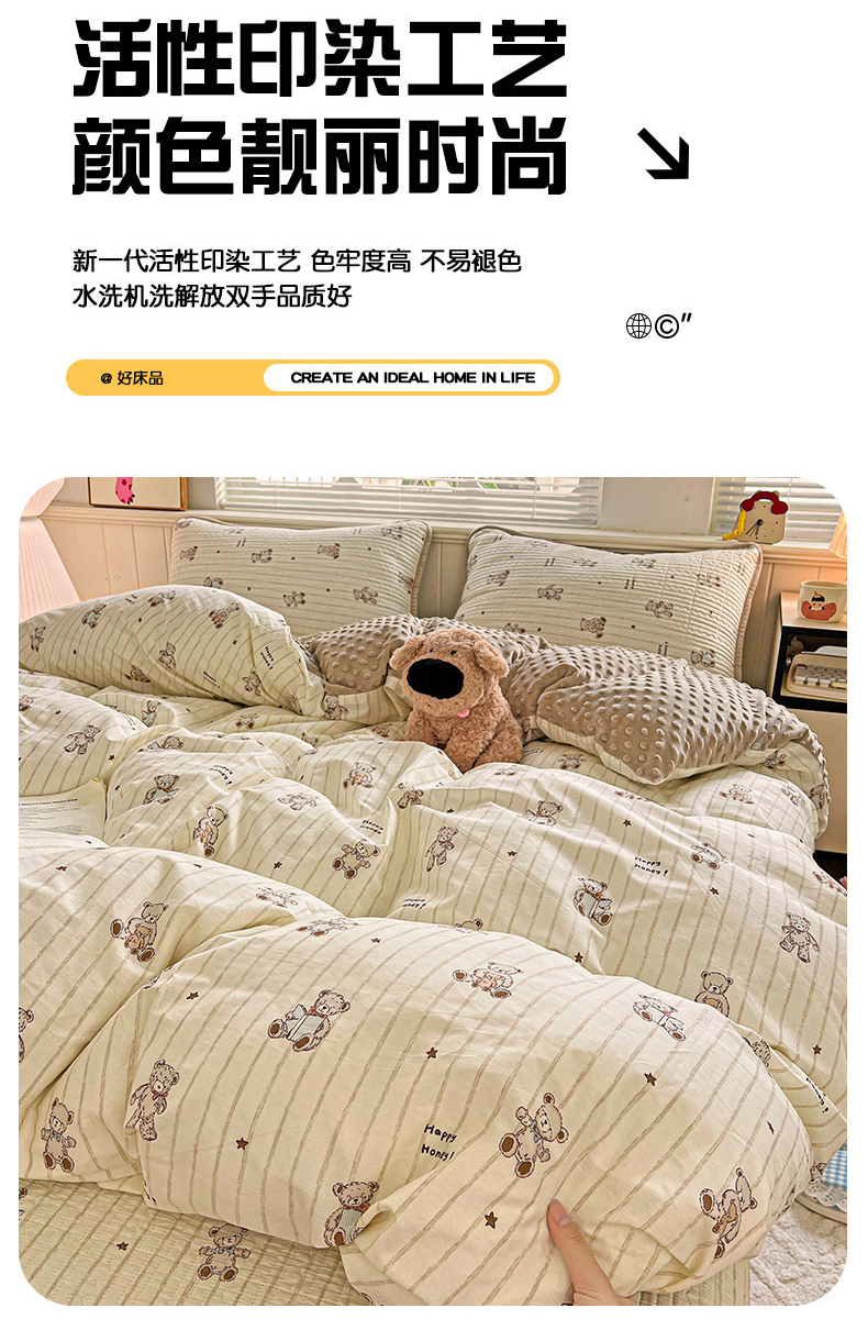 商品名称:漫时光 2025新款正面纯棉反面宝宝绒印花夹棉砂洗床盖四件套 条纹熊