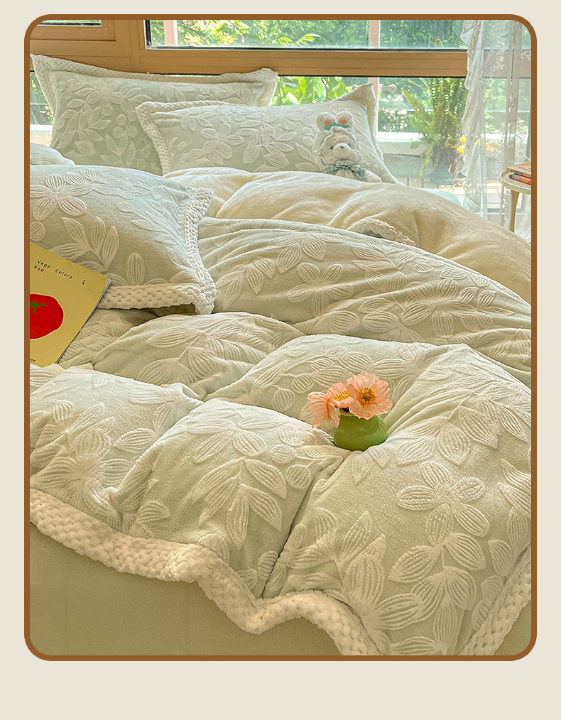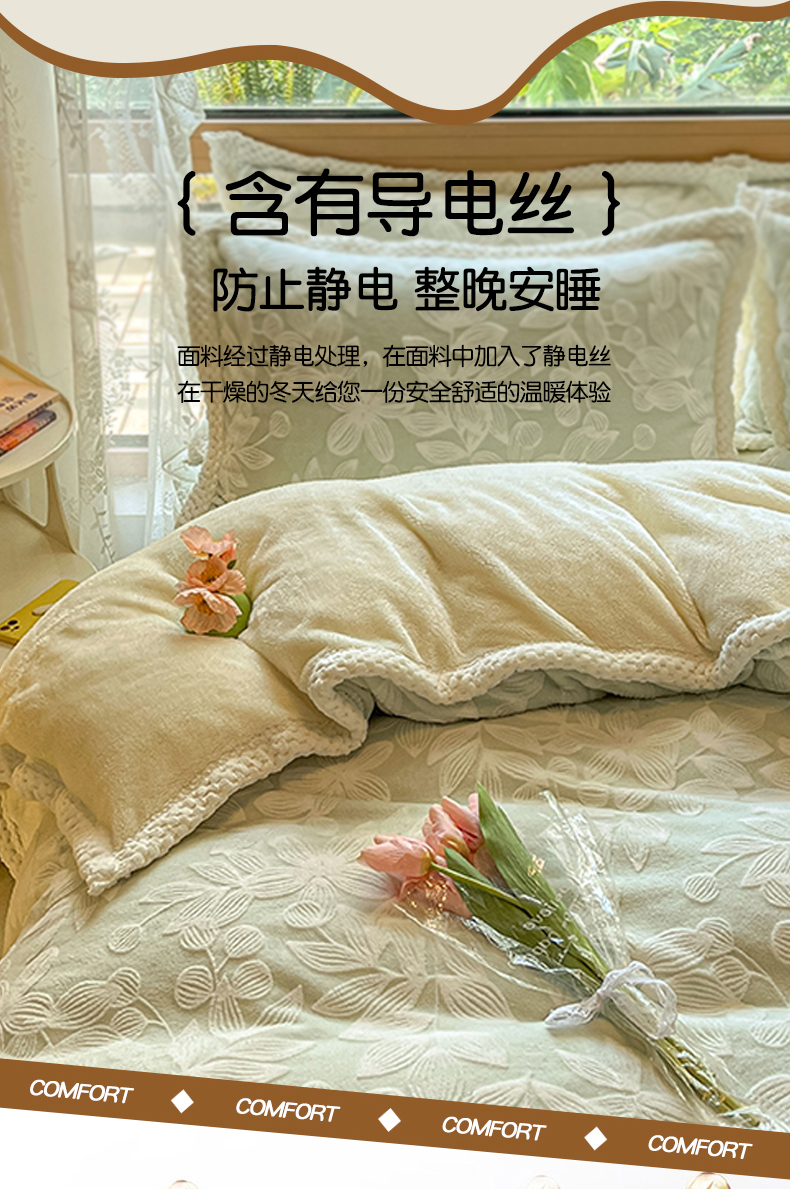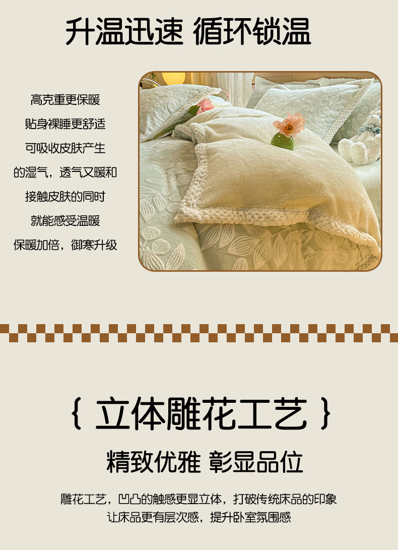 当前位置: 91家纺网 > 商品网购 > 床品套件 > 四件套 > 其它四件套 > 琪格格纺织 2025新款全消光包边立体简约清新雕花绒四件套 雕花包边-爱在秋冬 樱花粉