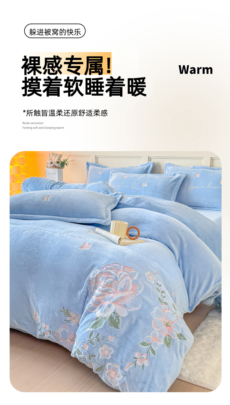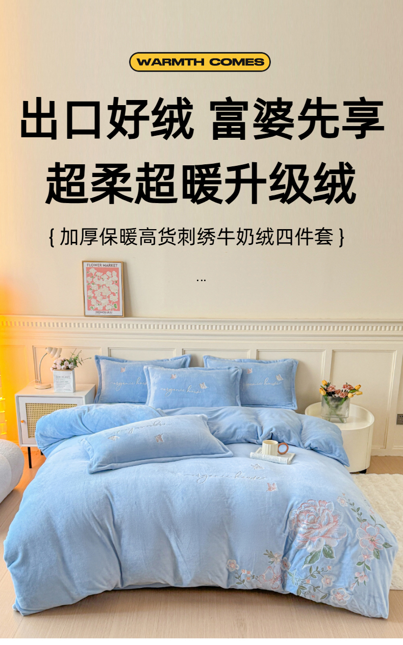 (总)【苏东来】2025高端加厚保暖外贸轻奢款纯色牛奶绒刺绣花四件套床单被套单品简约绒兔毛绒法莱绒婴儿绒套件,时光米黄,时光粉,时光卡其,时光天蓝,时光豆沙