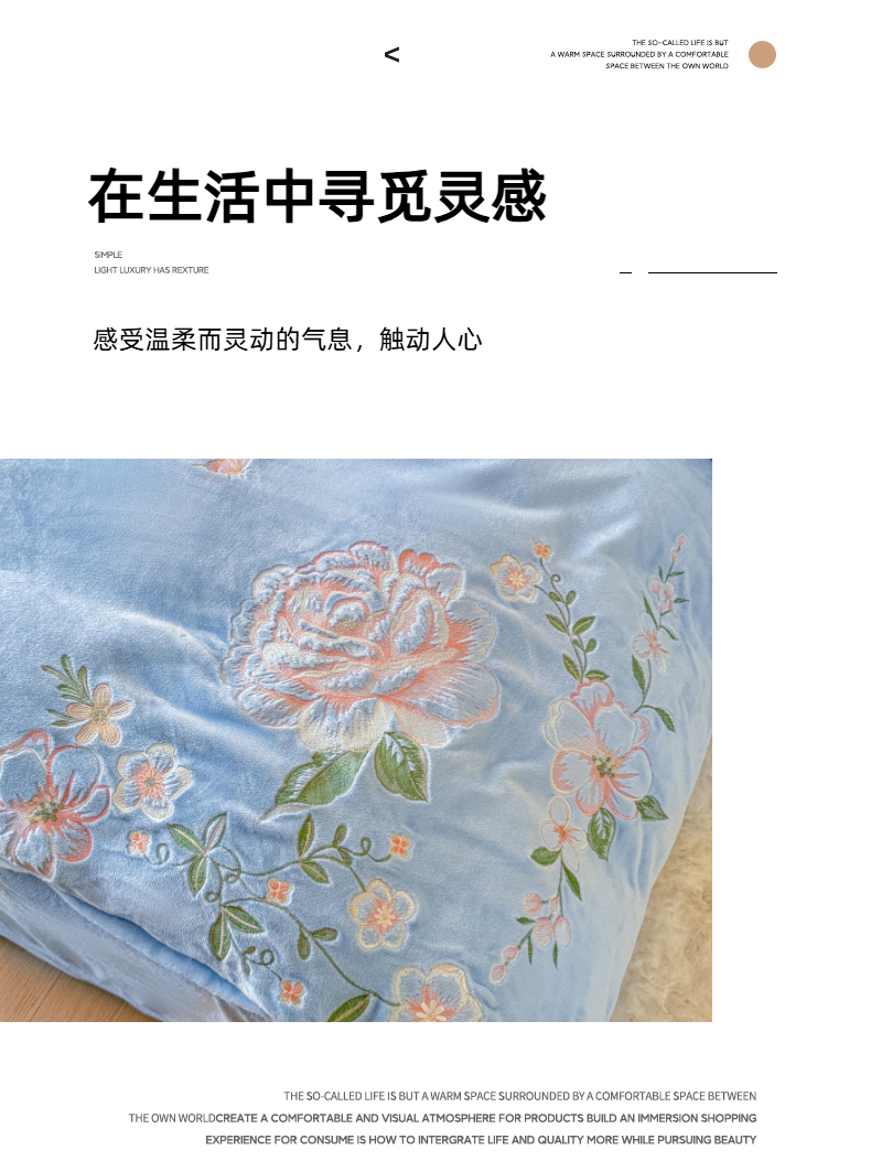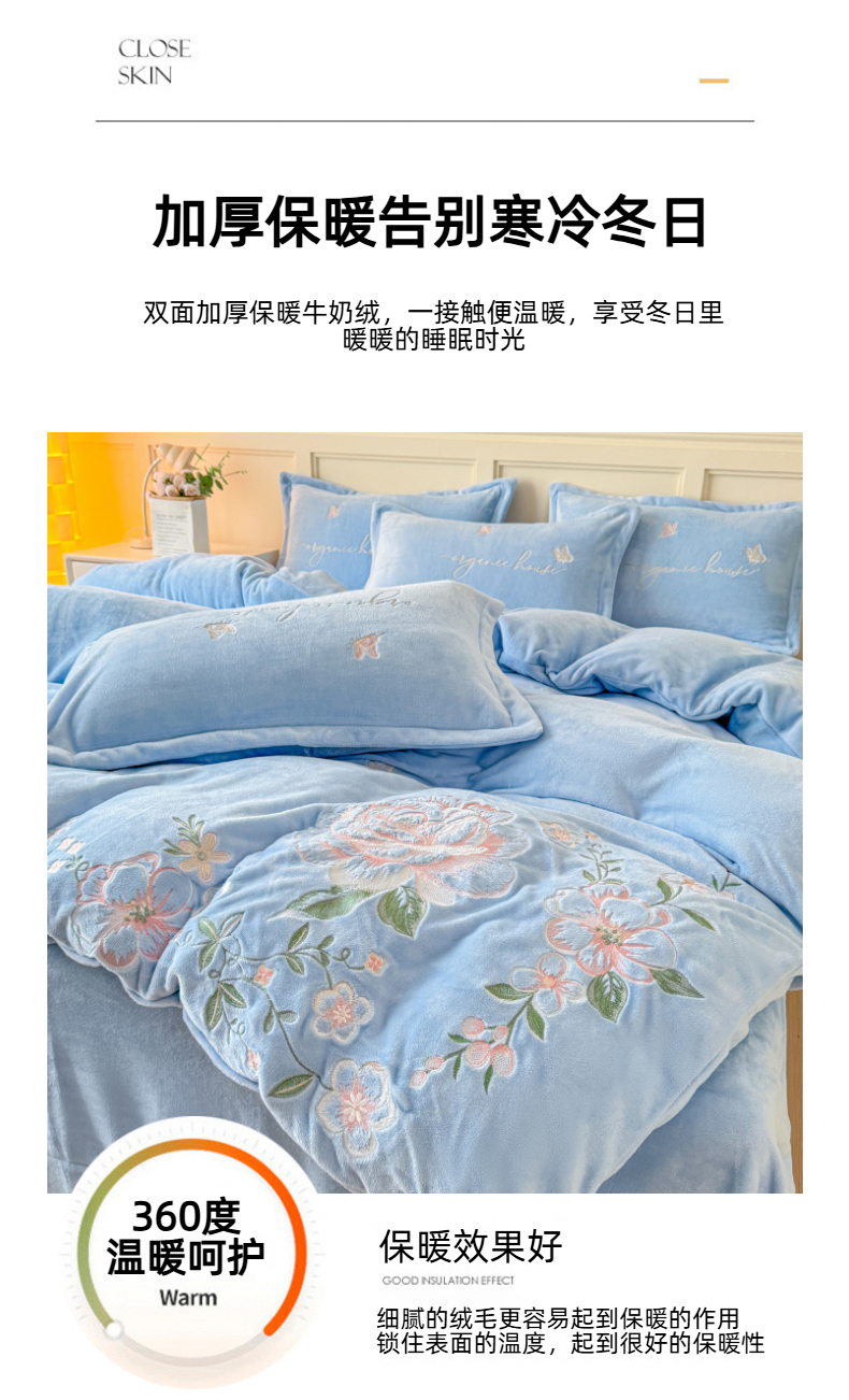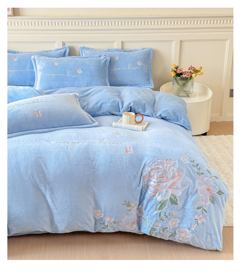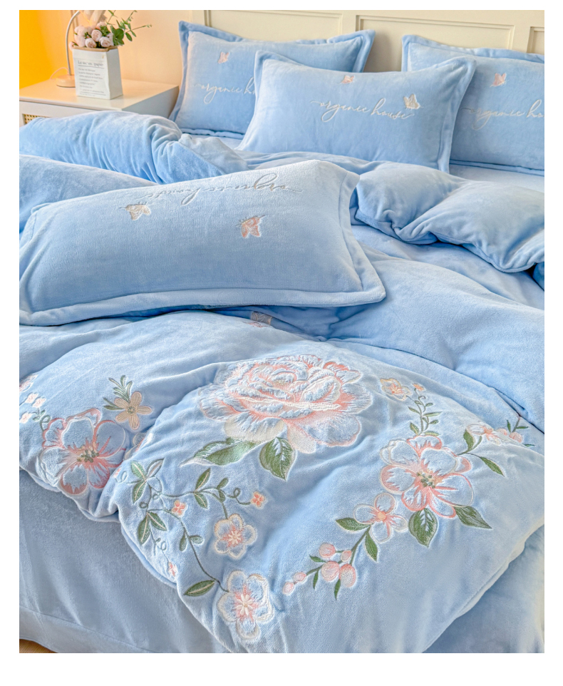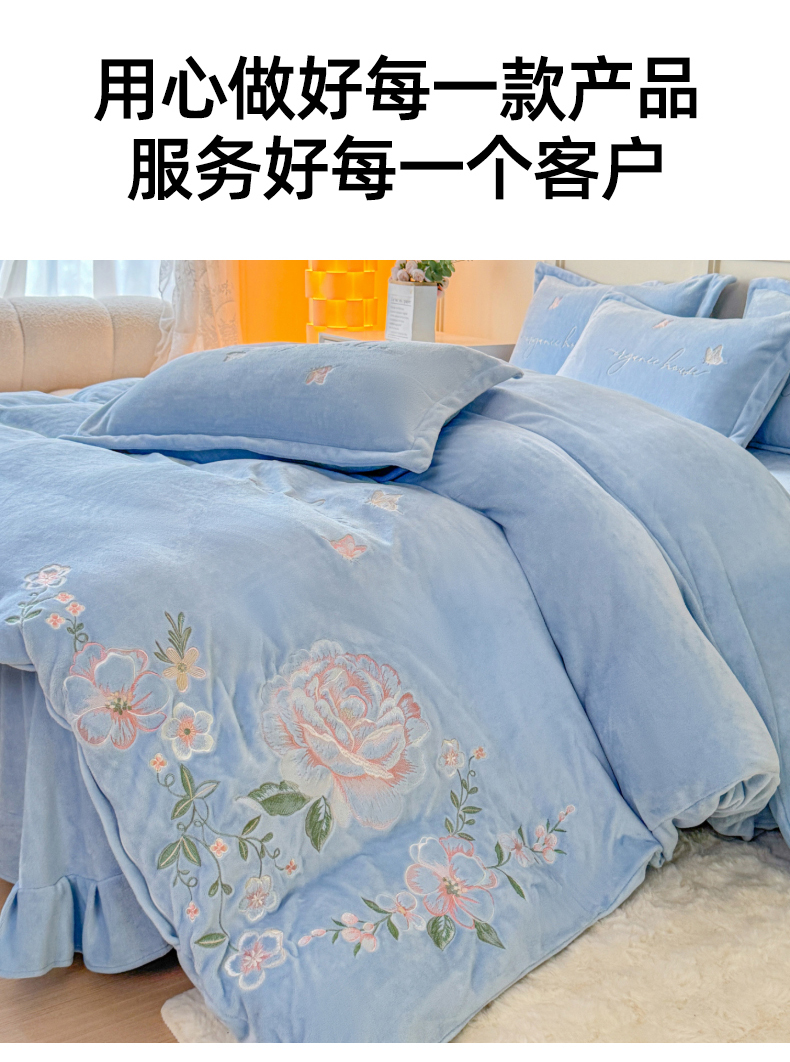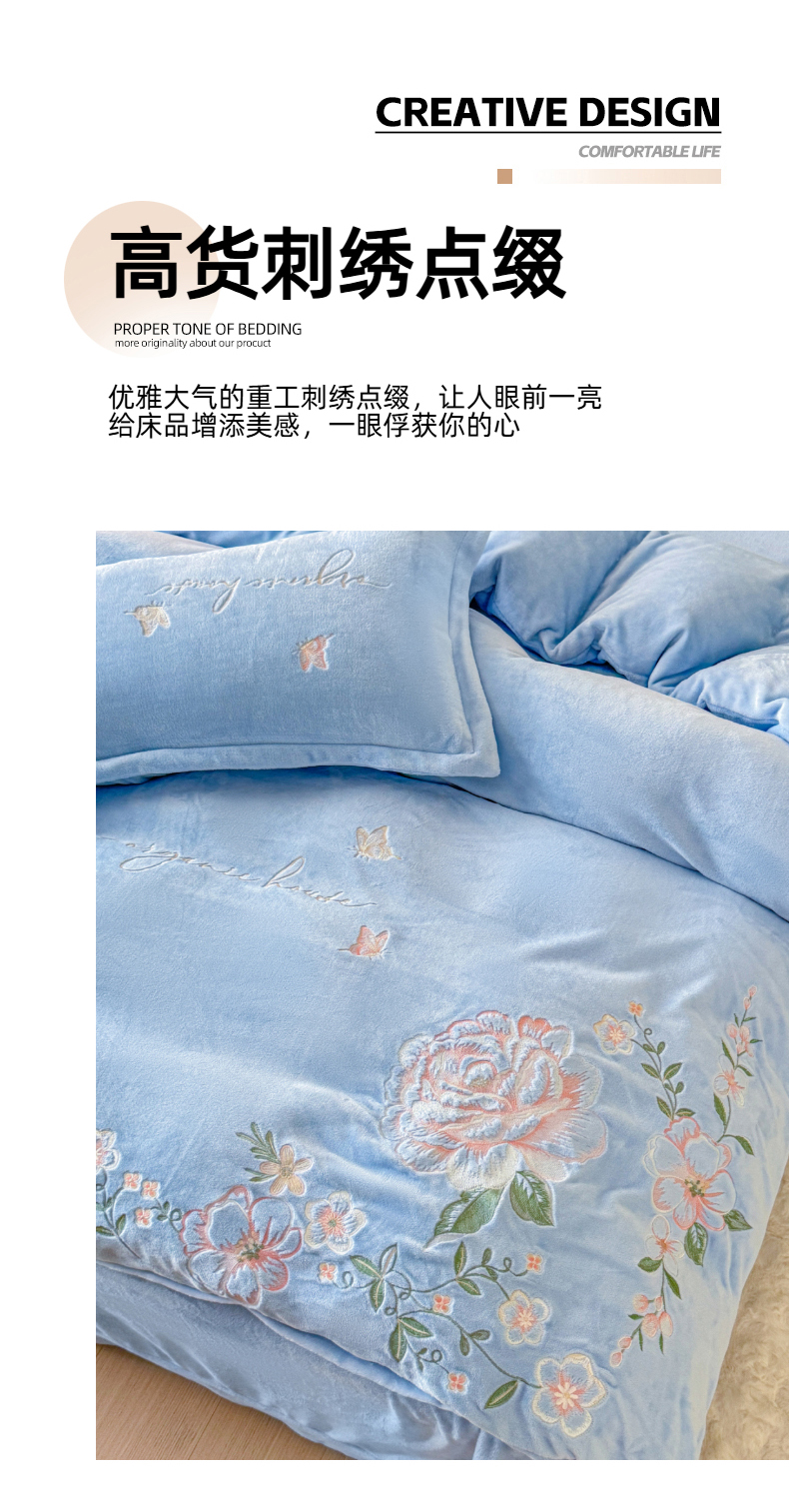 商品名称:新2025高克重清新公主风纯色花卉230g牛奶绒贴布绣花刺绣四件套床单被套单品加厚纯色花卉高克重牛奶绒贴布刺绣花四件套 高货天蓝(富婆款)