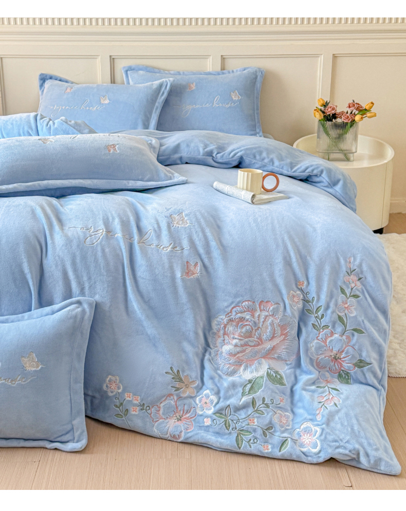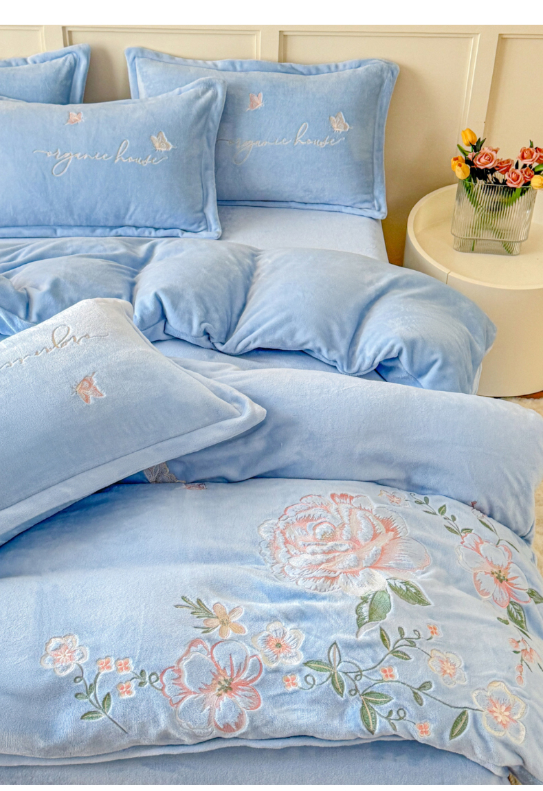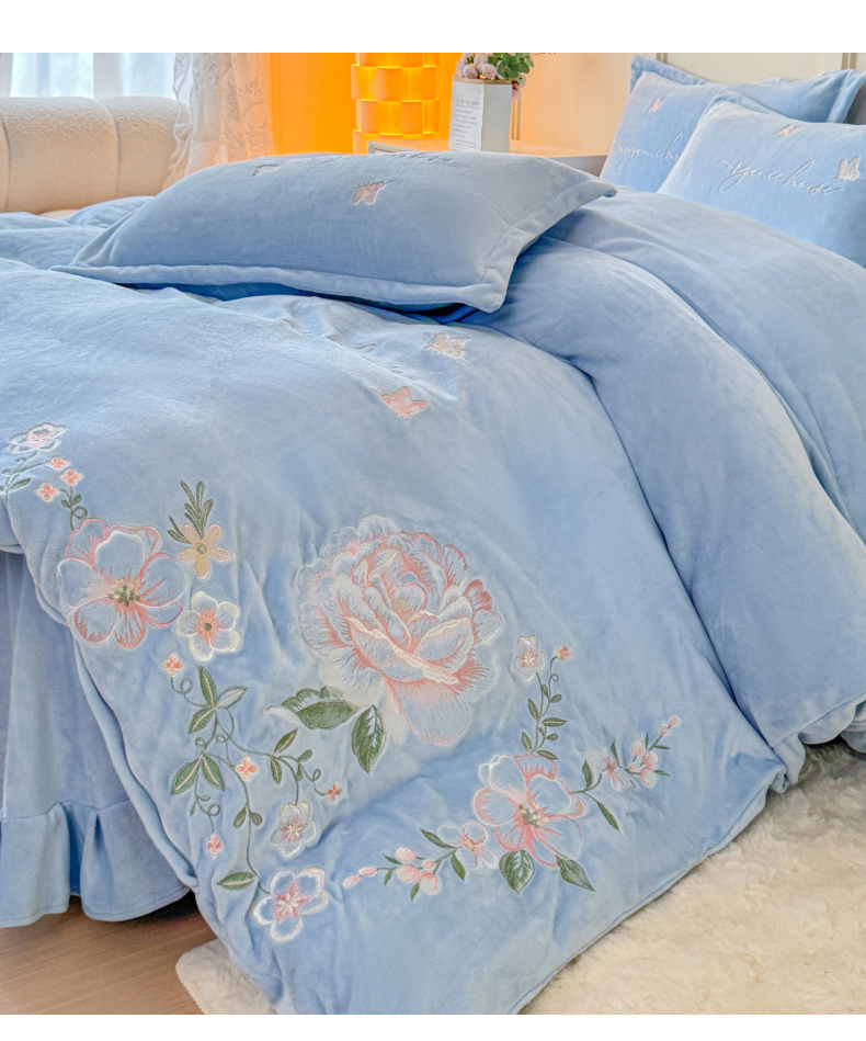 新2025高克重清新公主风纯色花卉230g牛奶绒贴布绣花刺绣四件套床单被套单品加厚纯色花卉高克重牛奶绒贴布刺绣花四件套 高货天蓝(富婆款)