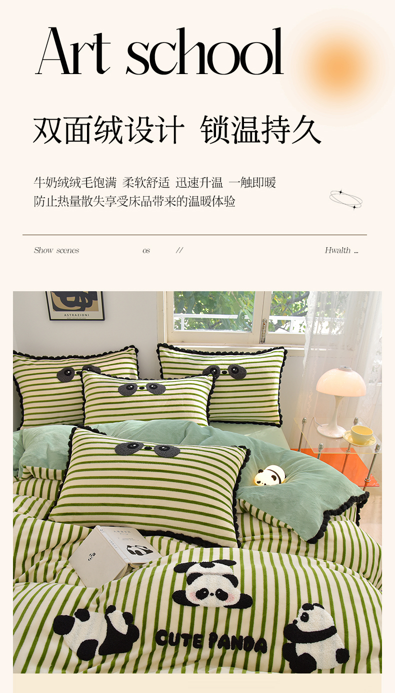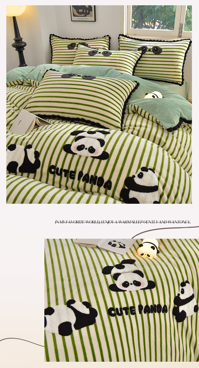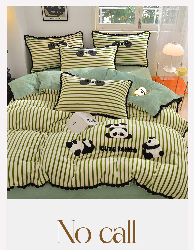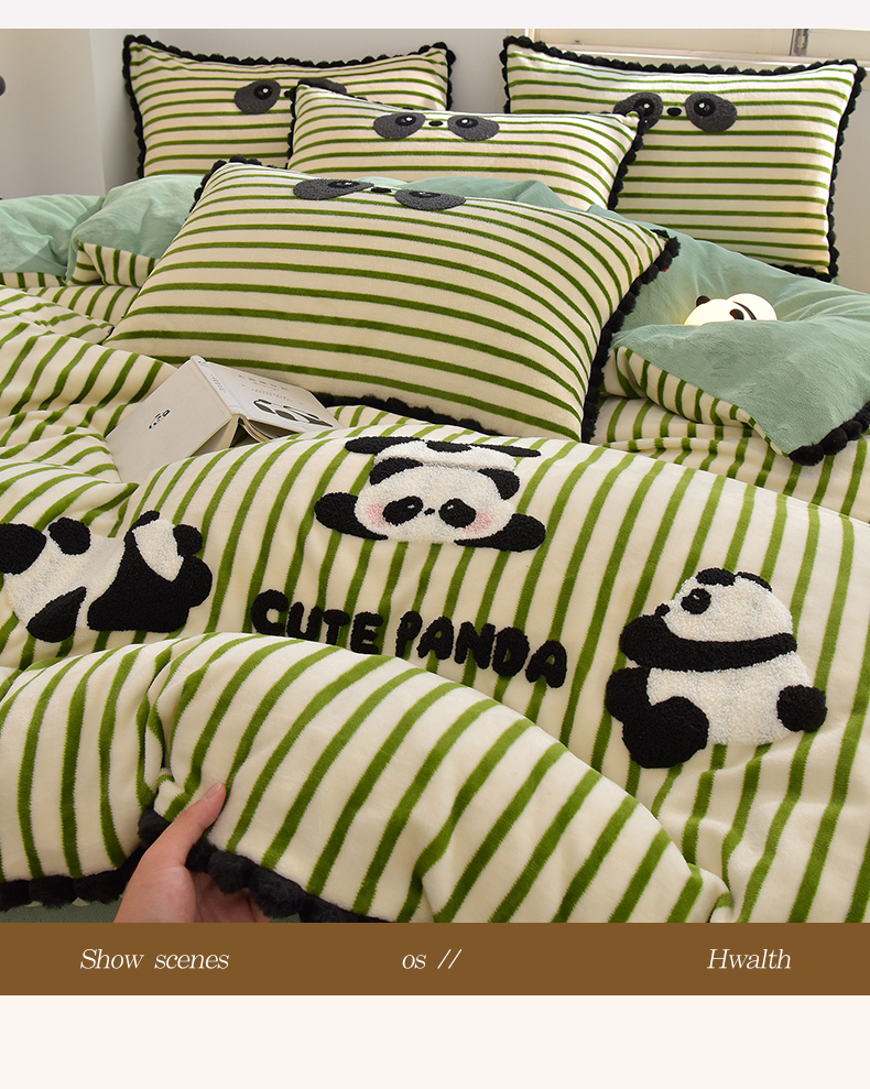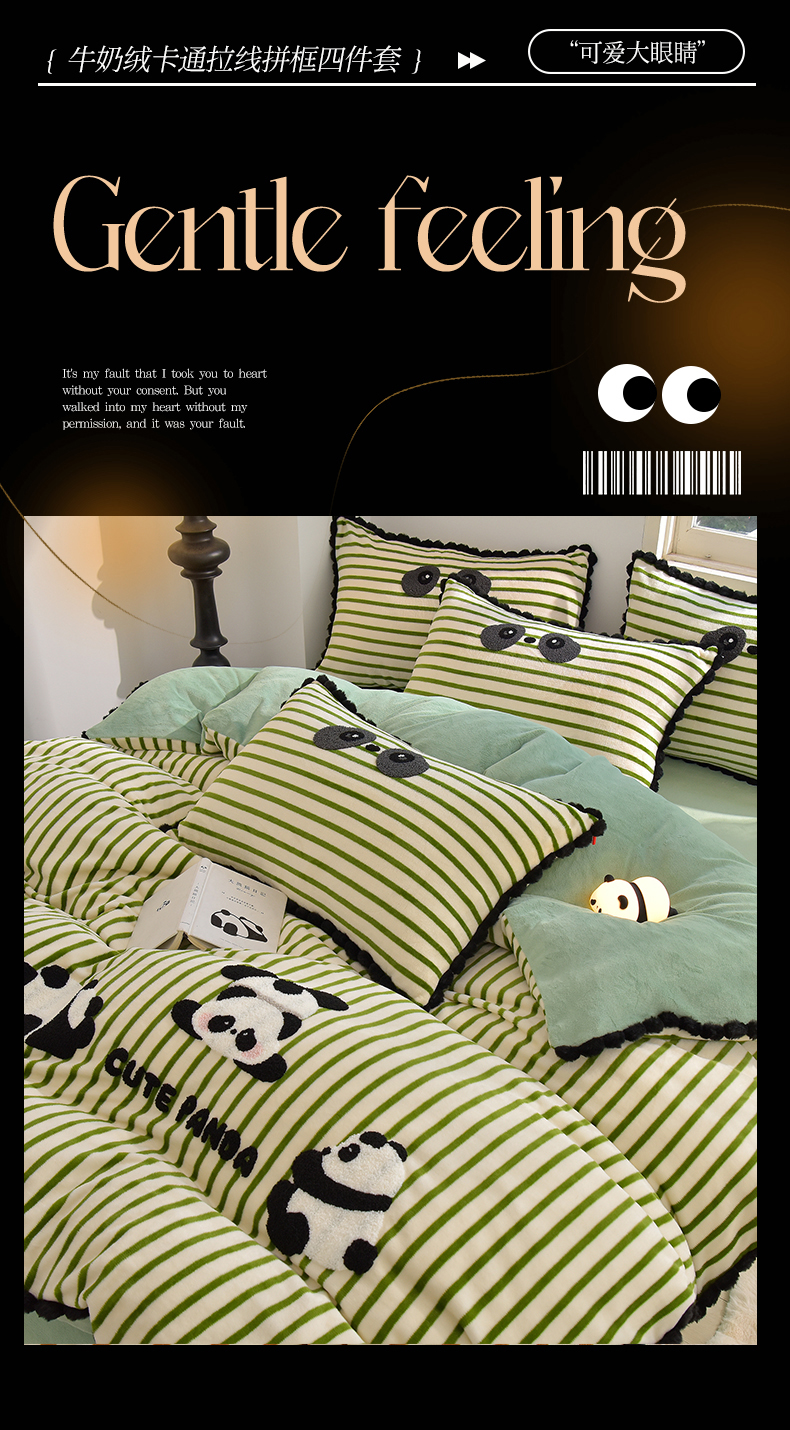 炫拼家纺 2025新款大眼萌小熊韩系黑毛球毛巾绣牛奶绒四件套 大眼萌小熊猫-绿
