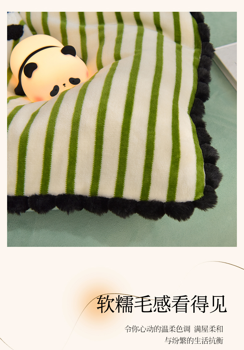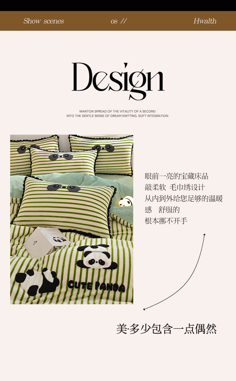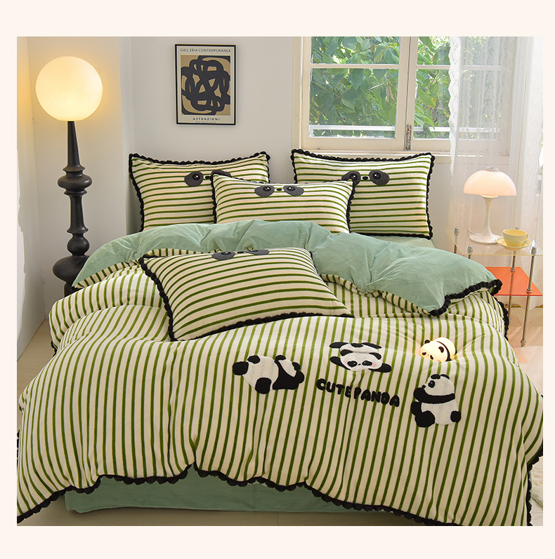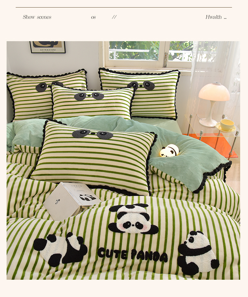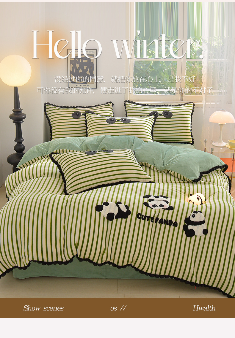 炫拼家纺 2025新款大眼萌小熊韩系黑毛球毛巾绣牛奶绒四件套 大眼萌小熊猫-绿