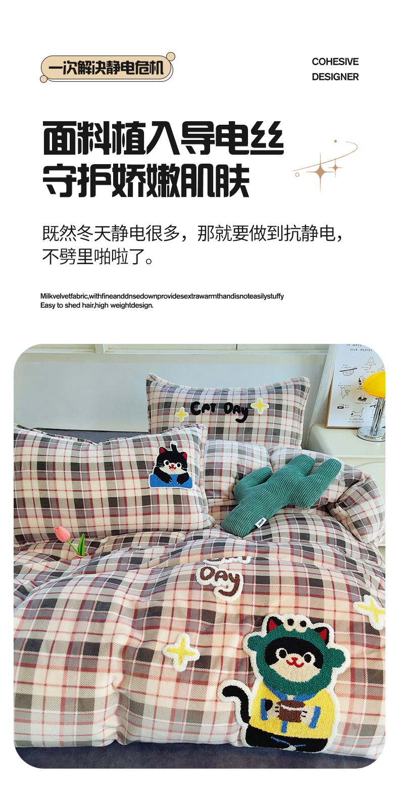 商品名称:炫拼家纺 2025新款高克重牛奶绒毛巾绣卡通四件套-可孚系列 可孚-咖啡猫