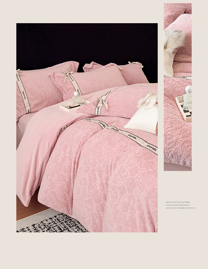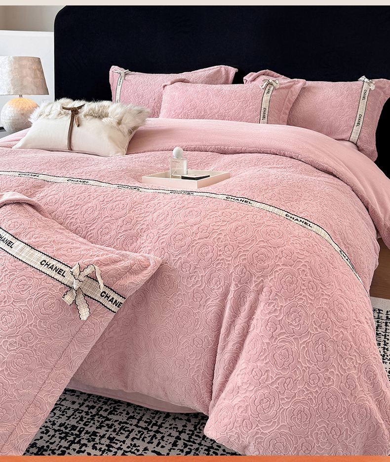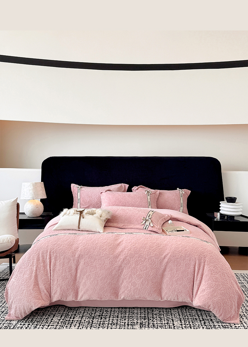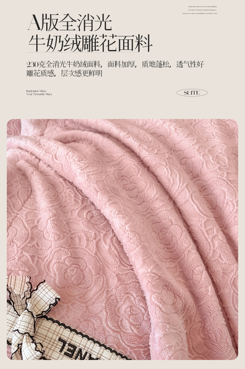 商品名称:金喜 2025新款230克全消光雕花绒四件套牛奶绒四件套-山茶花影 山茶花影-珊瑚粉