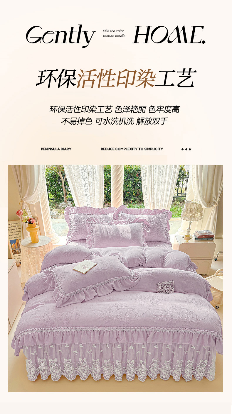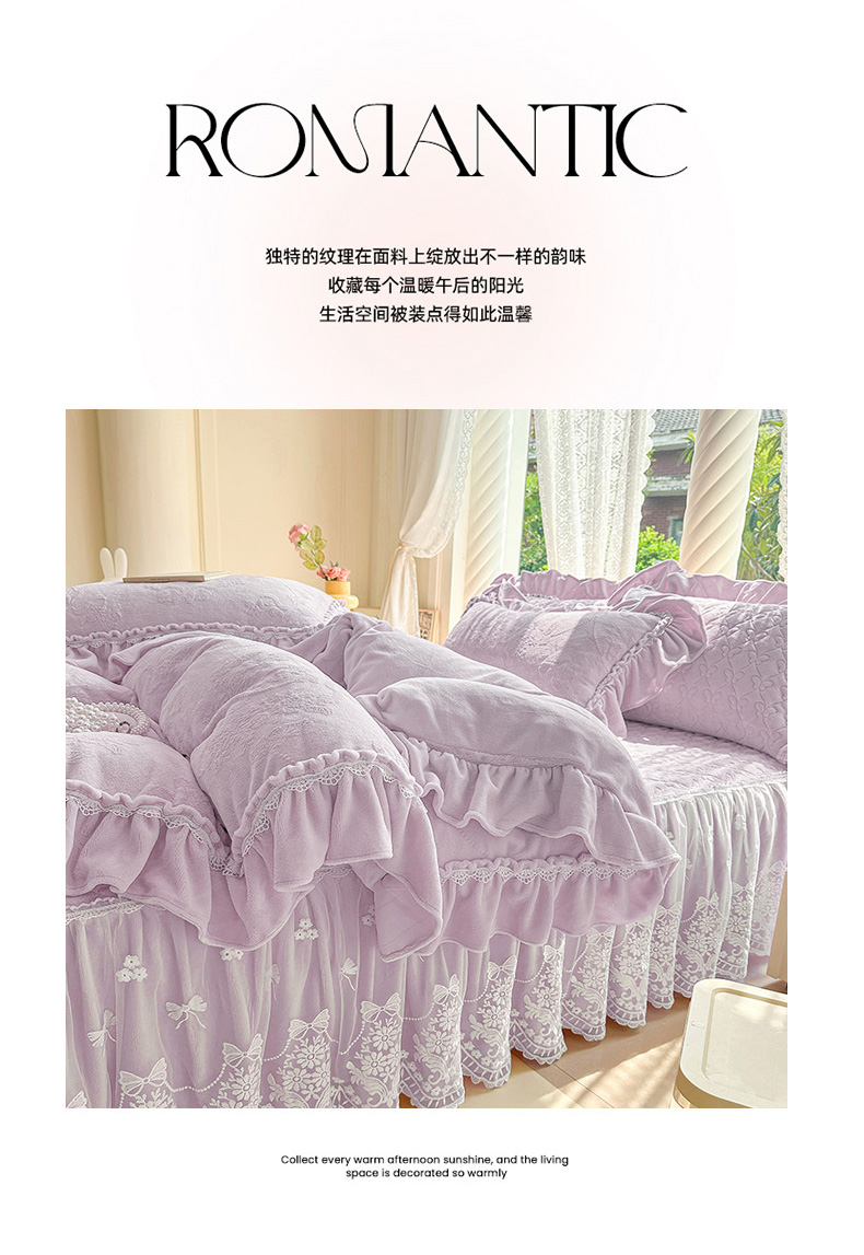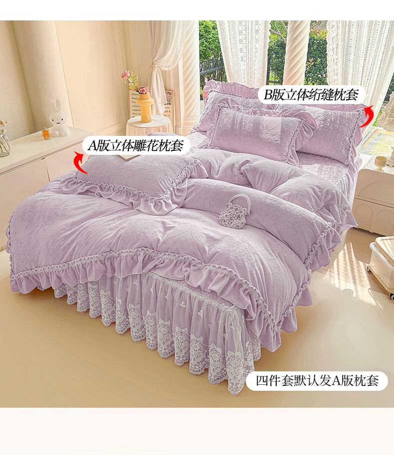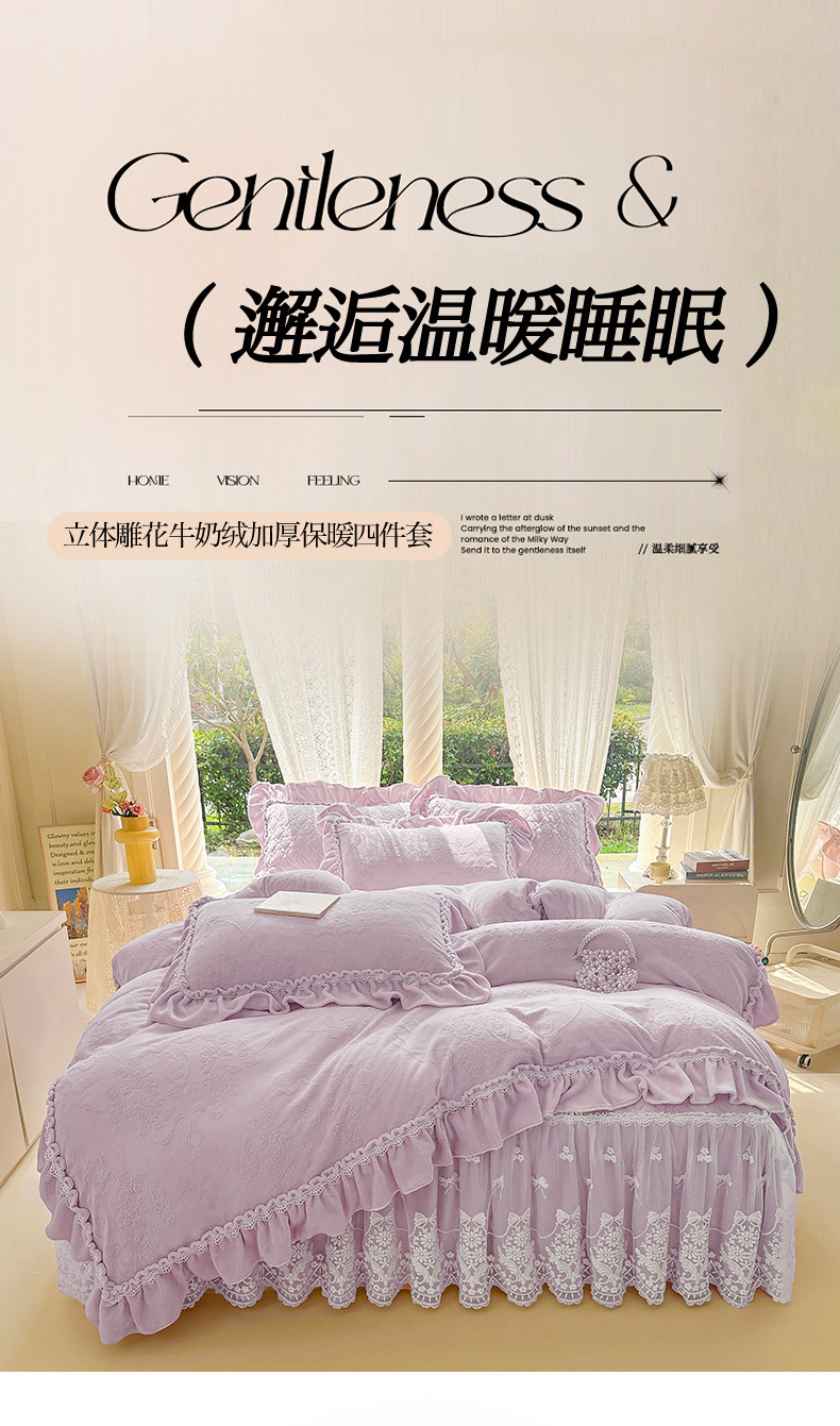 当前位置: 91家纺网 > 商品网购 > 床品套件 > 四件套 > 其它四件套 > 罗艺轩 【控价】2025新款立体雕花牛奶绒加厚保暖床裙款四件套-安琪儿 安琪儿-紫