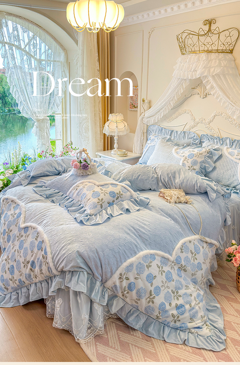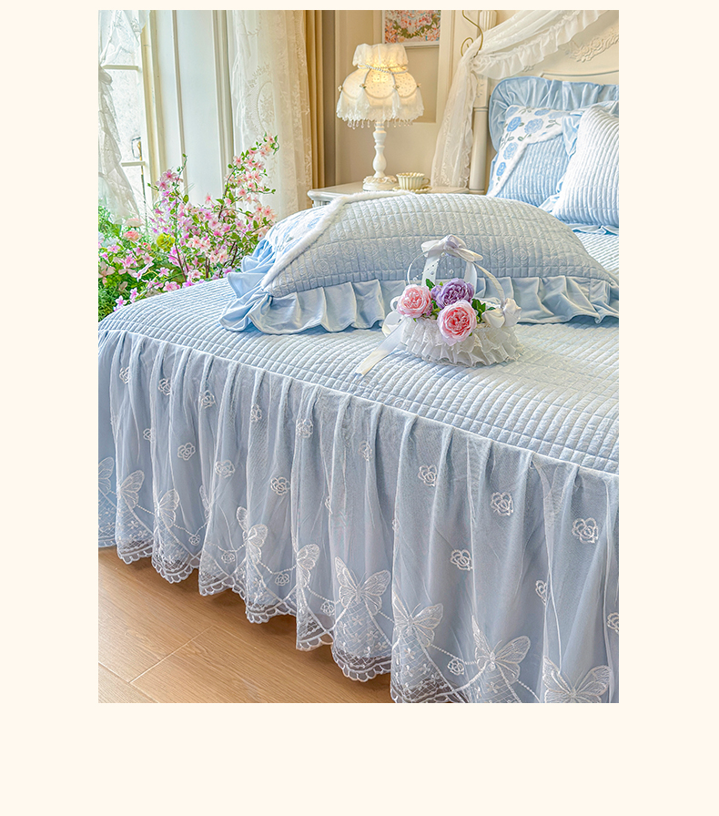 宜凡家纺 2025新款婴儿绒压花撞色双拼夹棉床裙四件套 床裙款-汐月