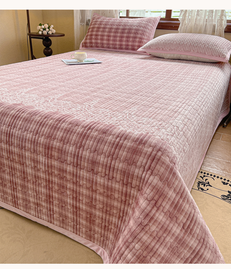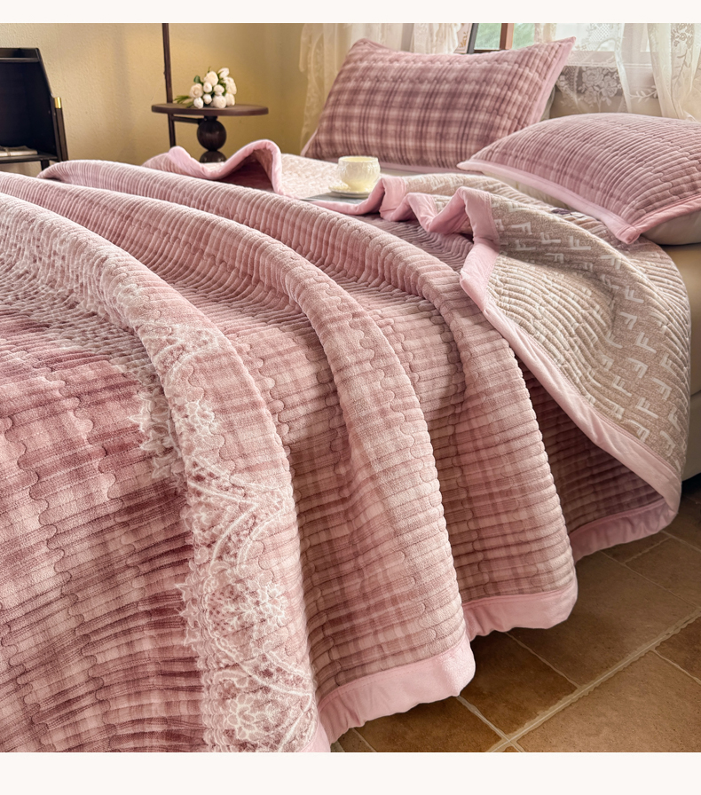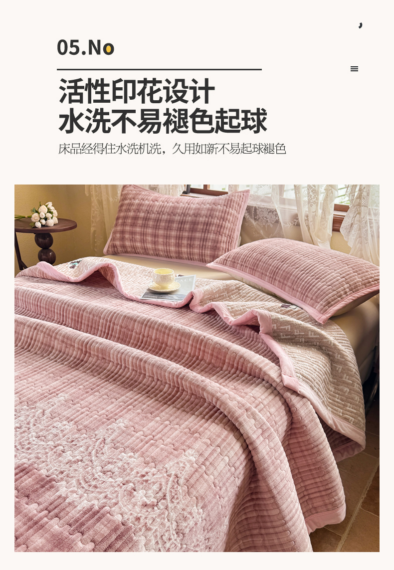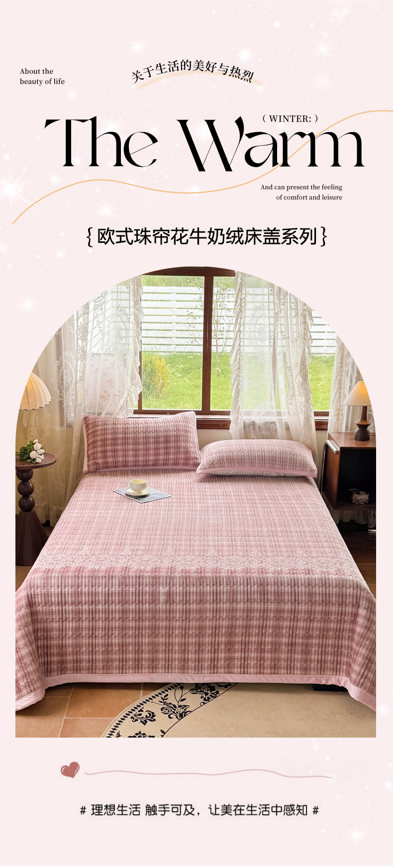 商品名称:慕木家纺 2025新款A类高克重欧式牛奶绒夹棉床盖珠帘花系列-场景二 珠帘花-豆沙