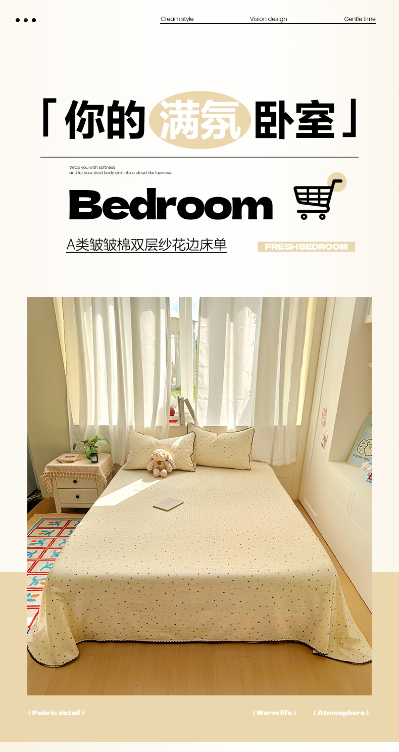 • 91家纺网 家纺一手货源 找家纺 优卡迪家纺馆 2025新款皱皱棉小花边床单(下载文件包含买家秀) 顽皮汪汪