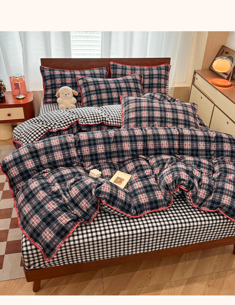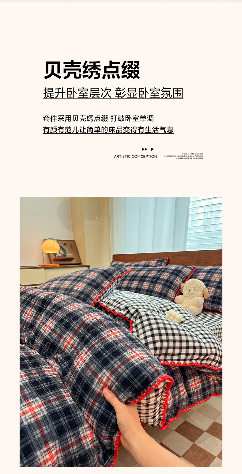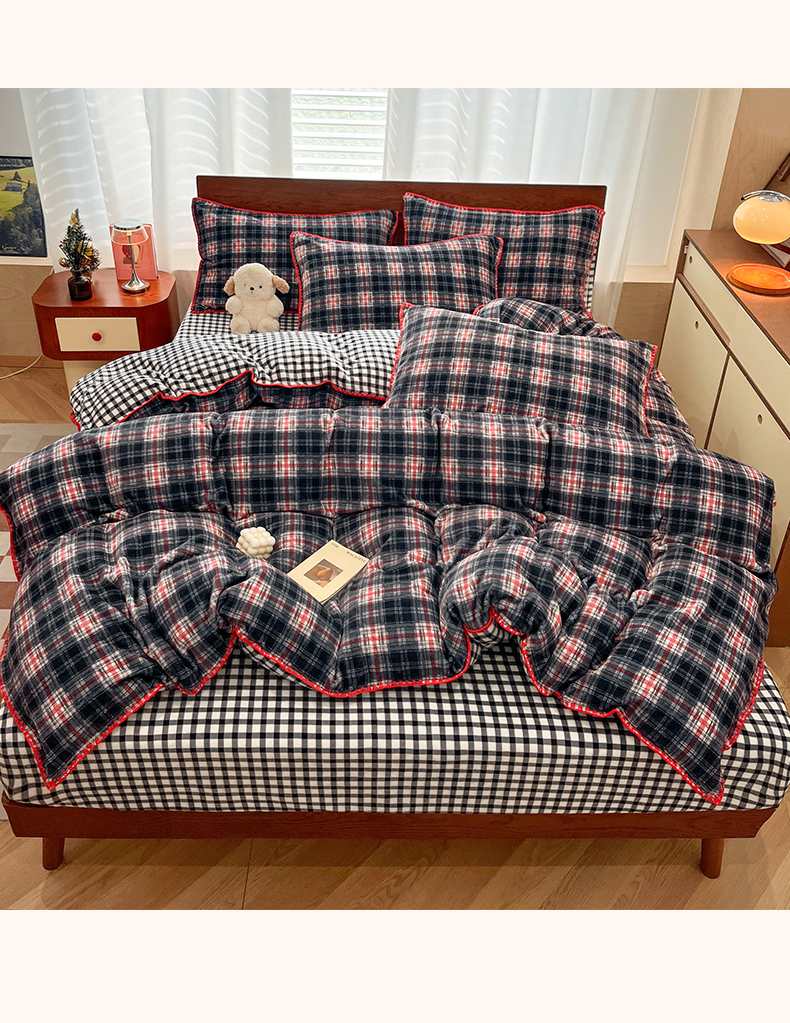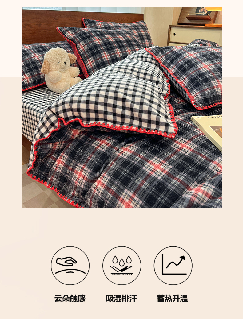 (总)格真 2025新款高克重暖芙绒牛奶绒印花三角针无印风四件套,休闲时光-卡其,凯瑟琳-红咖,拉菲-黄,宝丽-安格拉红,宝丽-黑白格