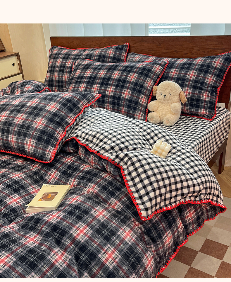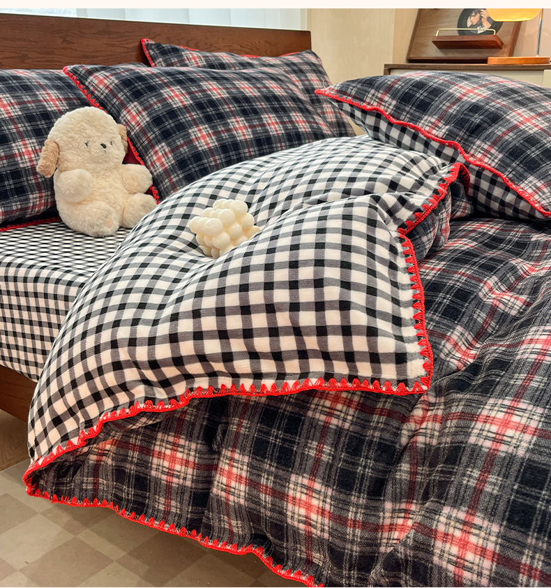 商品名称:格真 2025新款高克重暖芙绒牛奶绒印花三角针无印风四件套 宝丽-黑白格