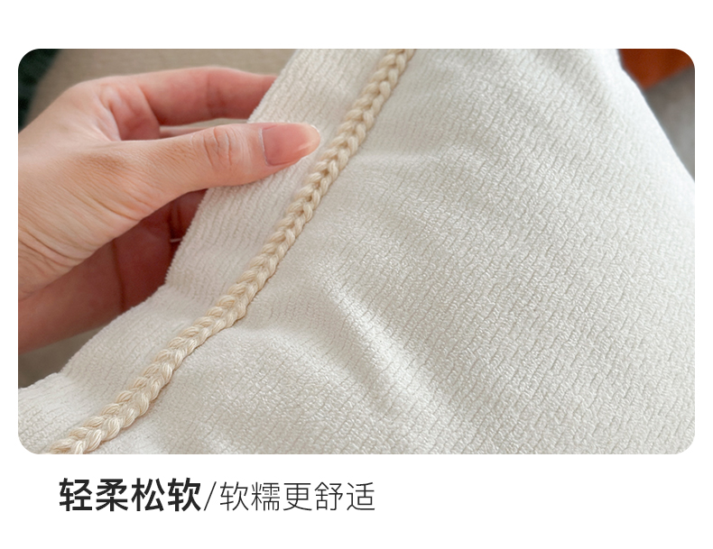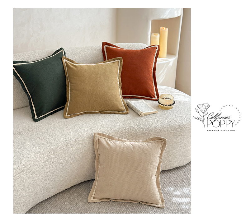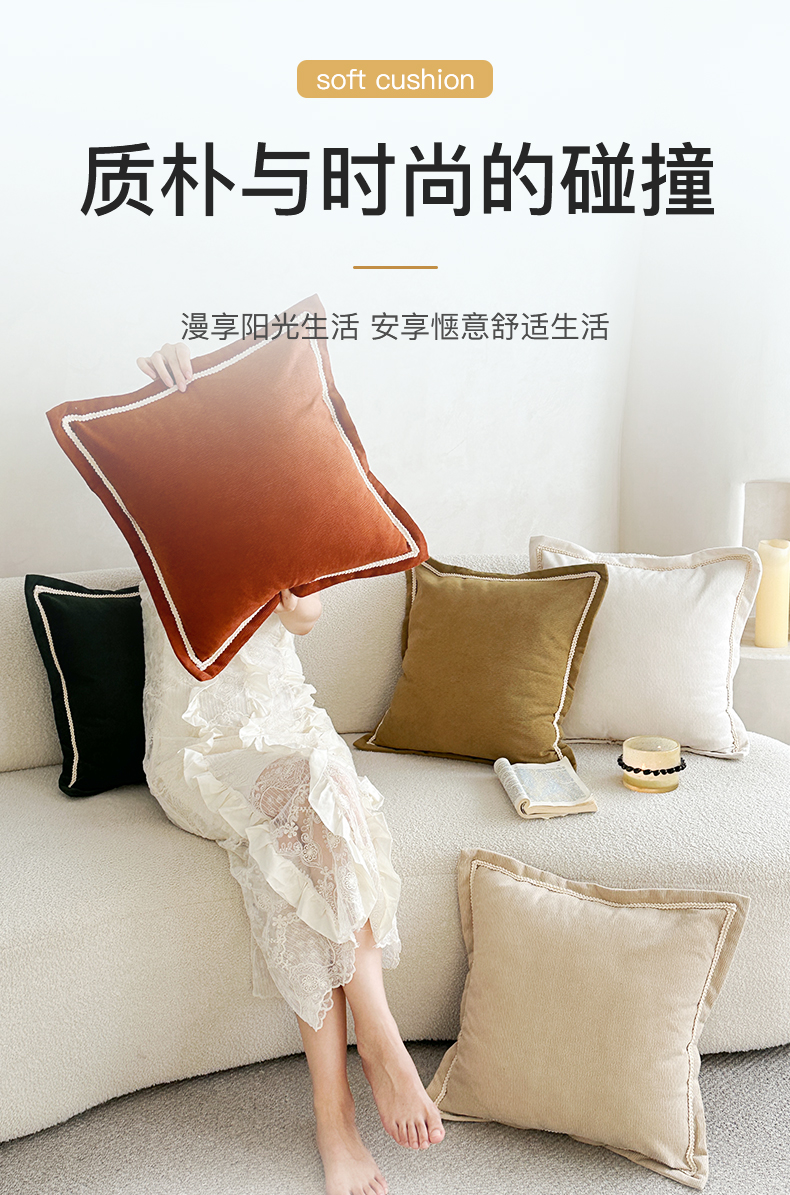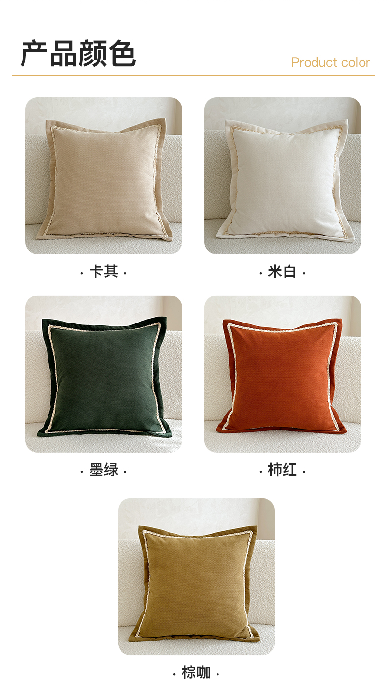 (总)美茉家居 2025新款加厚高端沙发布雪尼尔滚边方枕抱枕,缎面红,孔雀绿,南瓜橘,烟雨灰,珍珠白