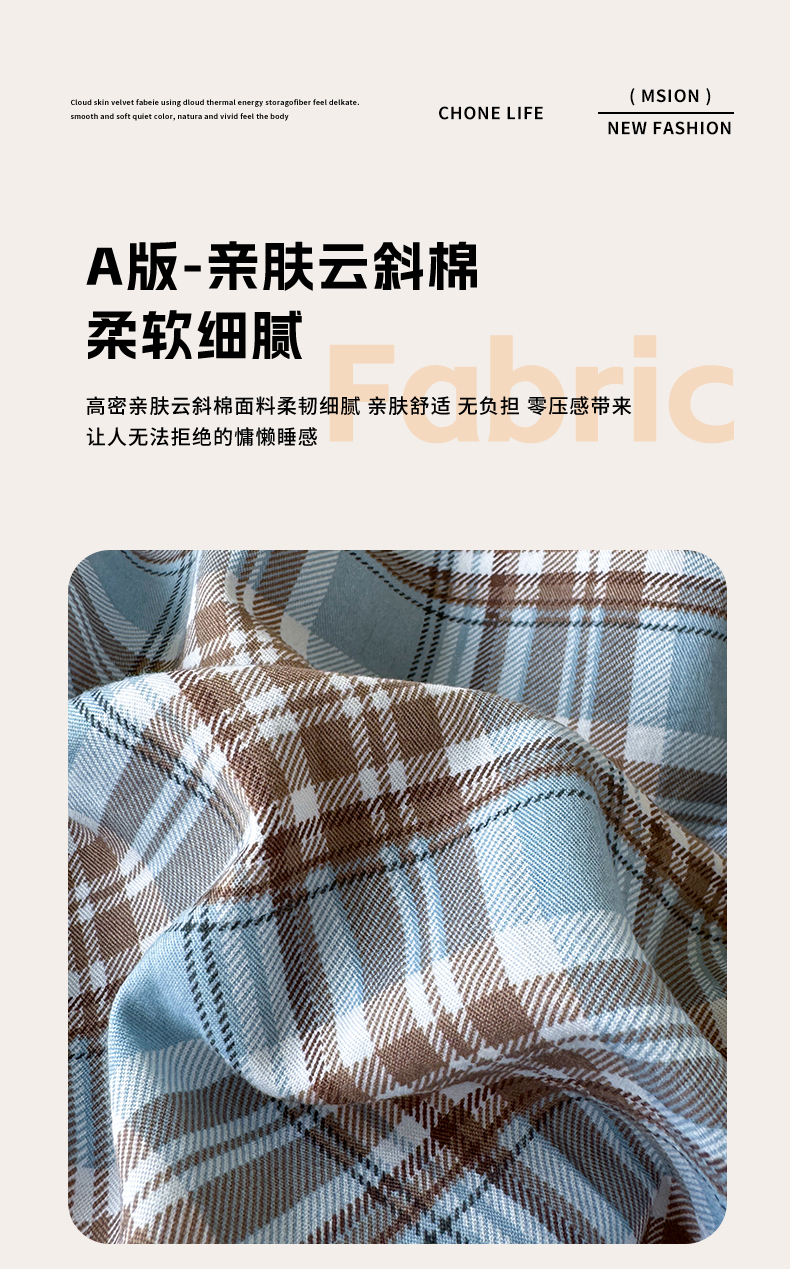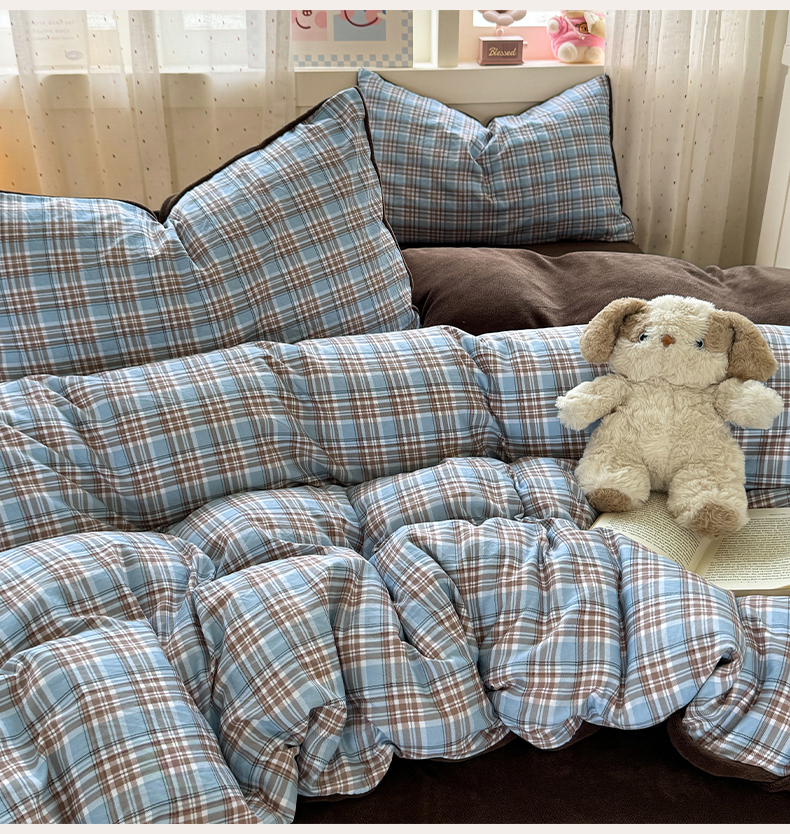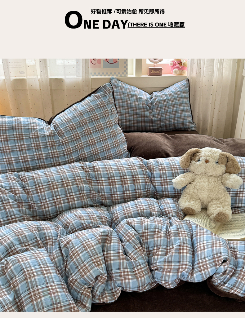 (总)十一家居 2025年秋冬新款A类亲肤云朵水洗棉无印风四件套-叙境系列,柏林蓝格+海青蓝,豆沙小格+粉玉,粉咖小格+粉玉,黑小格+铅灰,蓝咖小格+咖色,蓝小格+海青蓝,糖果小格+海青蓝,桃灰格+卡其