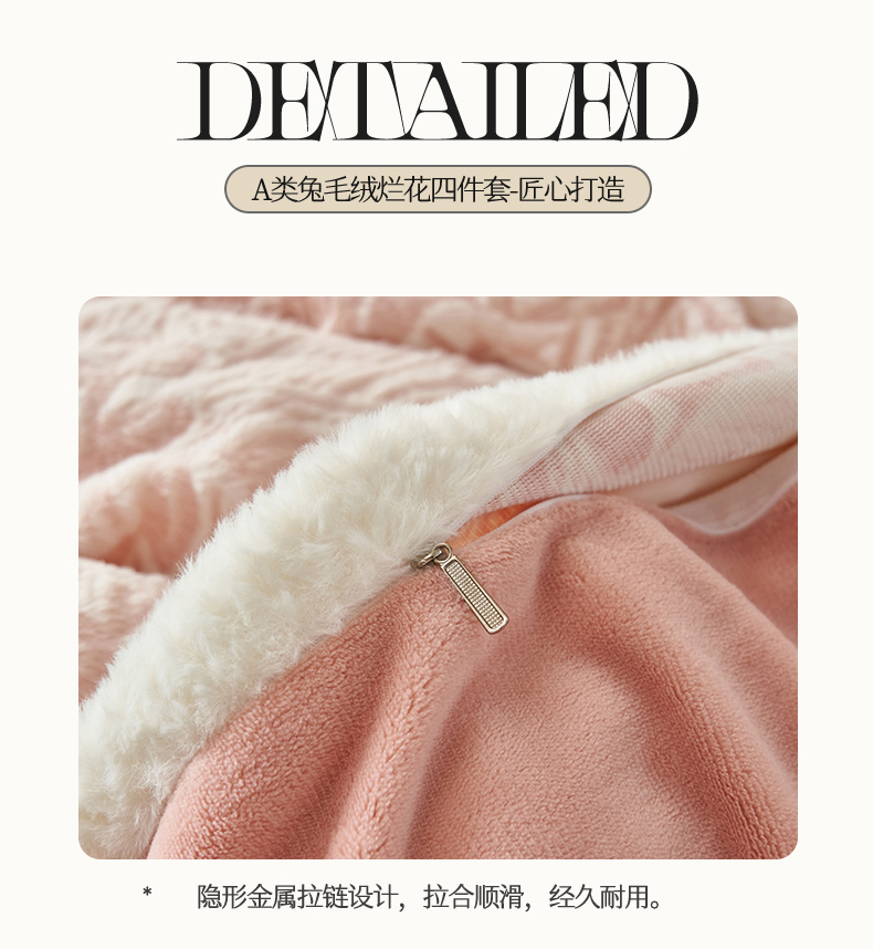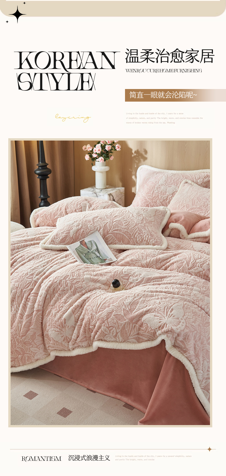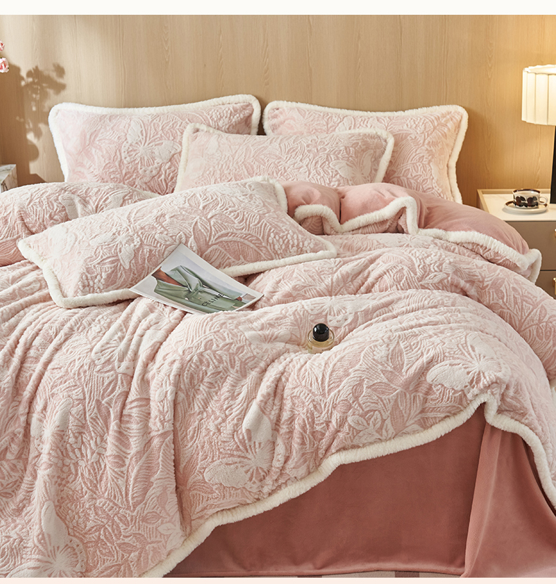 (总)金鹰 2025新款A类雕花牛奶绒烂花兔毛包边四件套,羽毛,波澜壮阔,繁花,蝴蝶梦,简爱,兰花,玫瑰物语,梦幻森林,清晨玫瑰,羽叶,仲夏晨歌