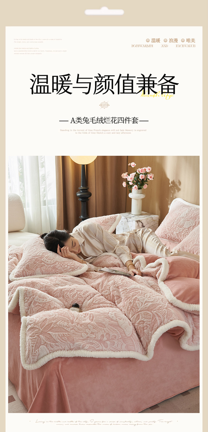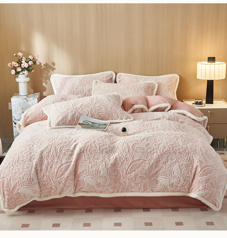 商品名称:金鹰 2025新款A类兔毛绒烂花四件套牛奶绒四件套加厚保暖绒套件 蝶恋-粉色
