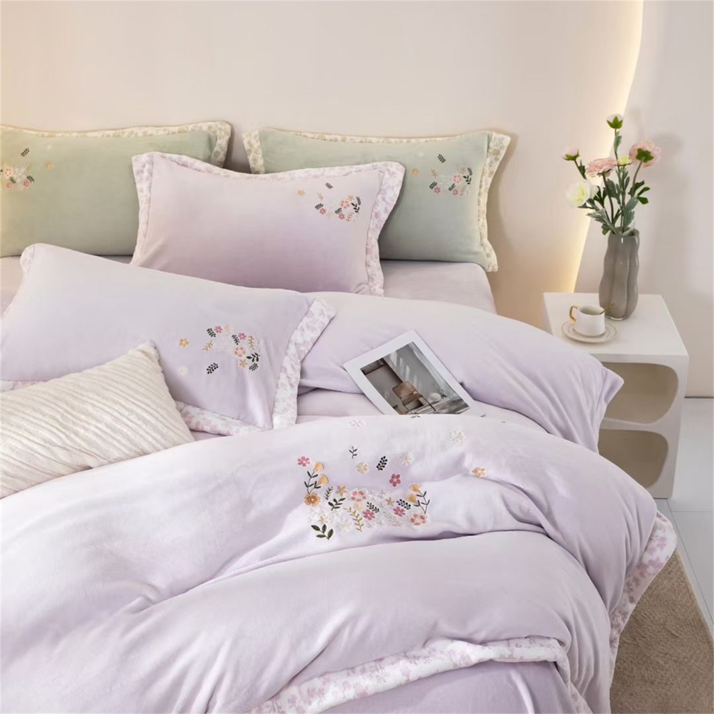 (总)玖琳家纺 2025新款双面240克全消牛奶绒铂金牛奶绒四件套-罗伦丝系列,碧水绿,湖蓝色,卡其,魅力紫,蜜桃粉,组合图