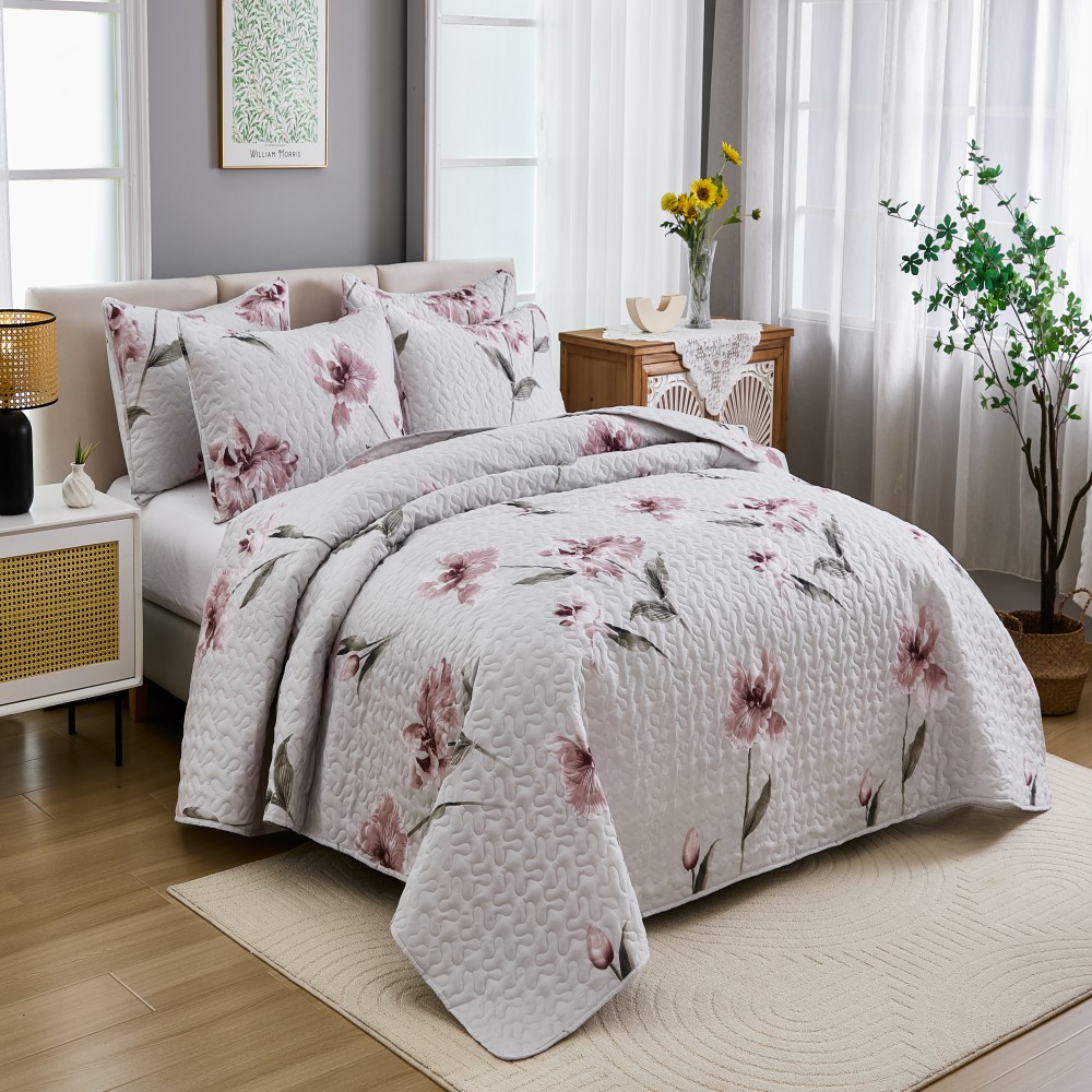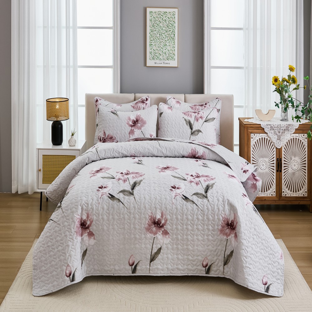 跨境专供 2025新款绗缝被四季通用床可水洗夹棉绗缝床盖,梅花白,梅花灰