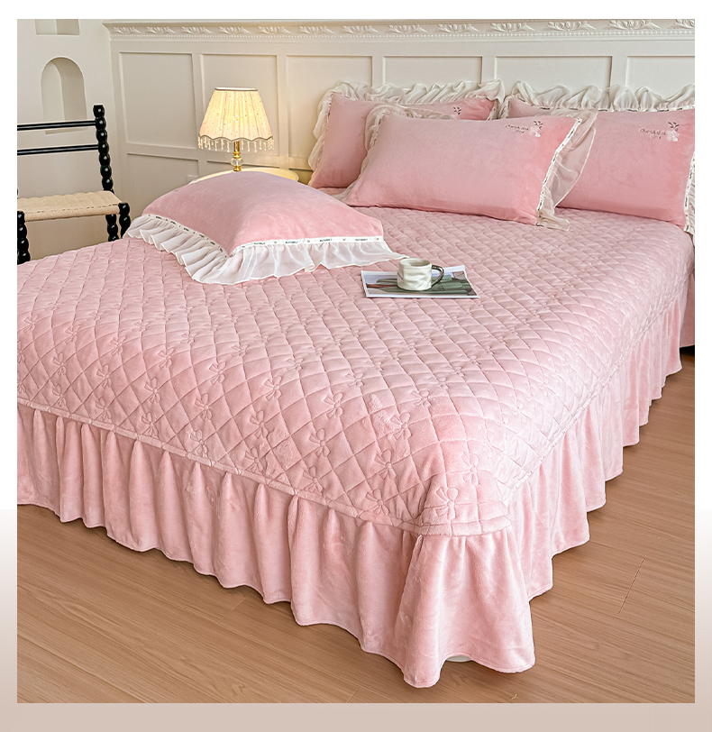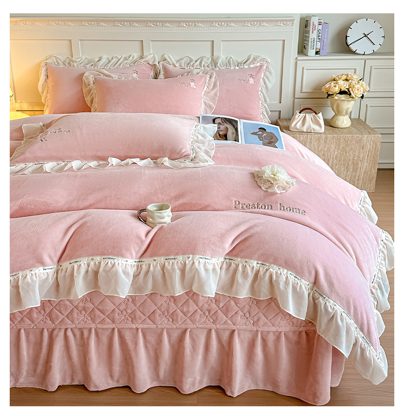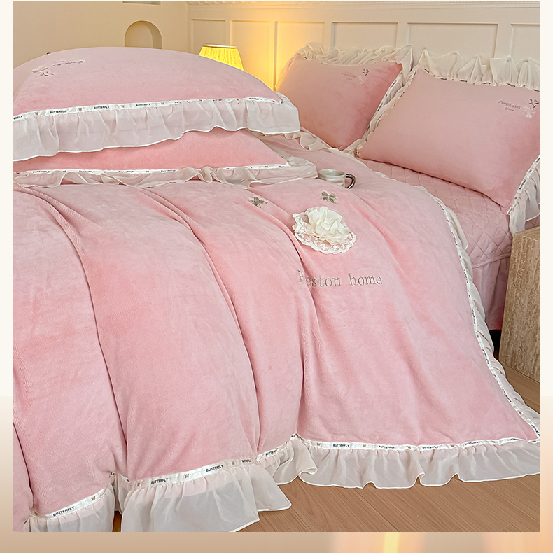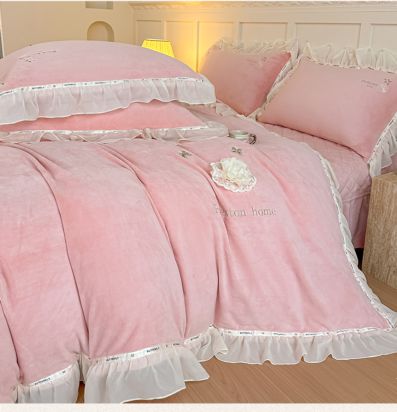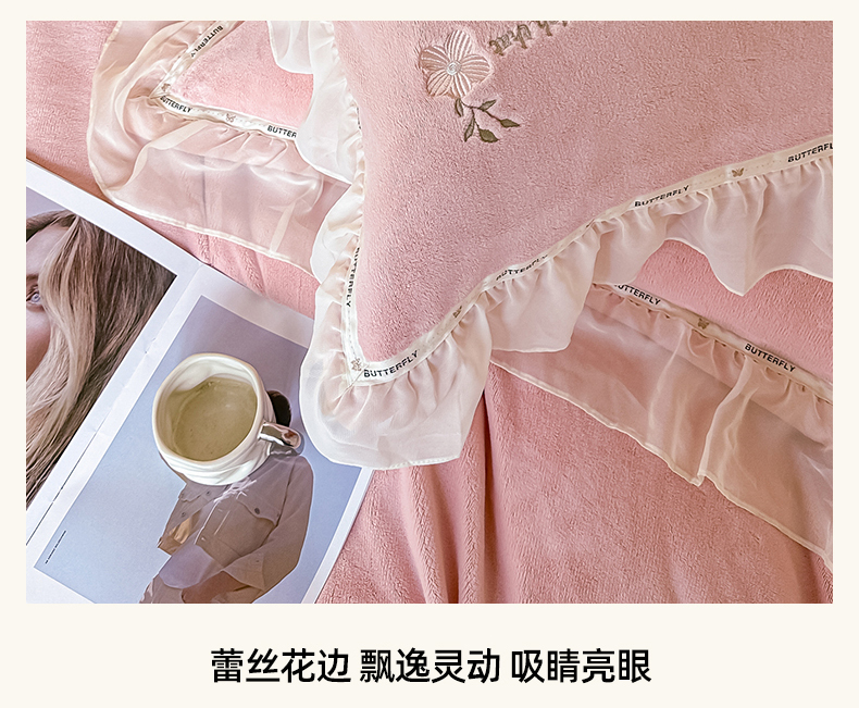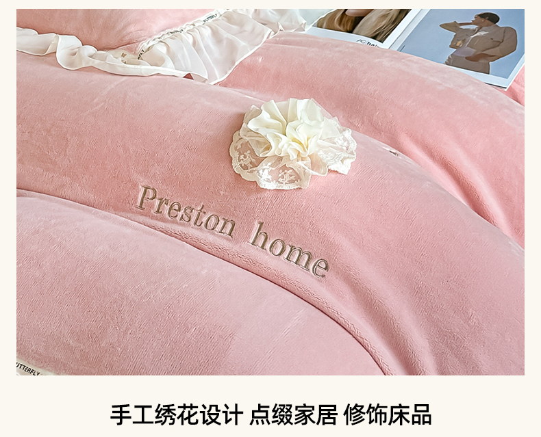商品名称:(总)诺可 2025新款牛奶绒手工绣花蕾丝花边床盖款四件套-雪纷飞