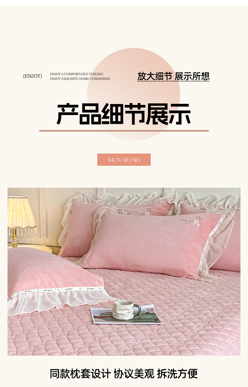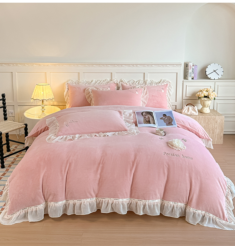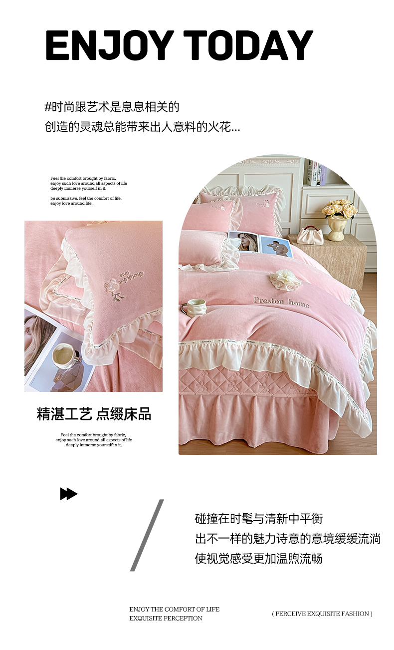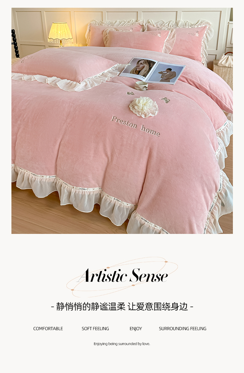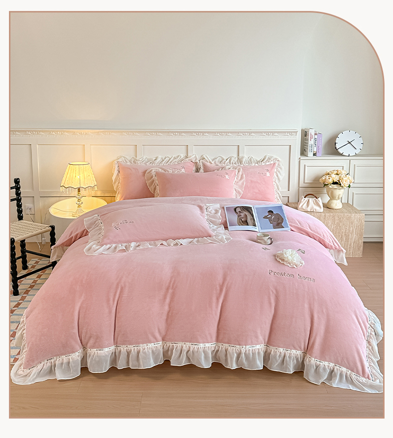 商品名称:(总)诺可 2025新款牛奶绒手工绣花蕾丝花边床盖款四件套-雪纷飞