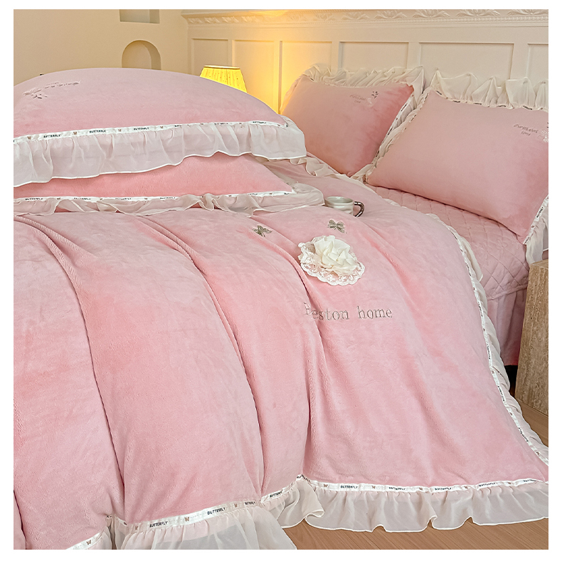 (总)诺可 2025新款牛奶绒手工绣花蕾丝花边床盖款四件套-雪纷飞