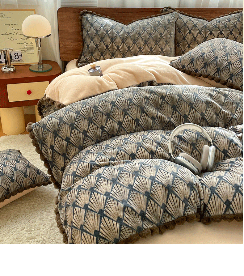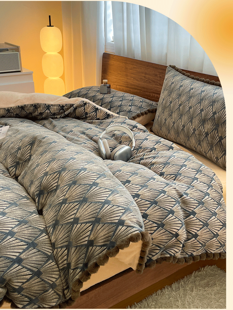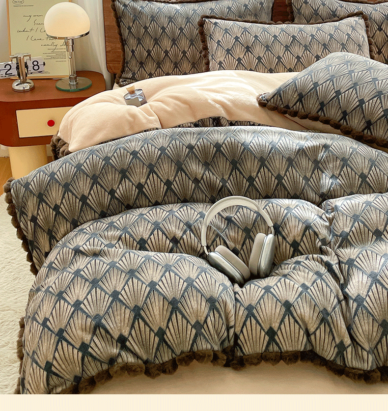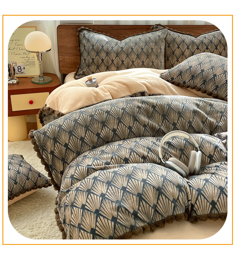 商品名称:羚羊语家纺 2025新款230克全消光雕花绒牛奶绒兔毛球四件套轻奢风立体着色烂花牛奶绒提花加厚保暖床单床笠三件套 蜜绒绒-影青褐