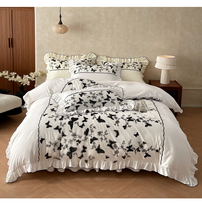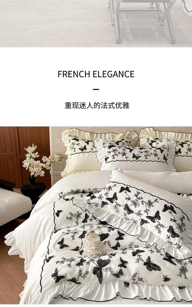 当前位置: 91家纺网 > 商品网购 > 床品套件 > 四件套 > 其它四件套 > 乐卧家居 2026新款130克磨毛法式宫廷感浪漫精致刺绣丝黑蝴蝶荷边四件套-蝶梦 蝶梦-白