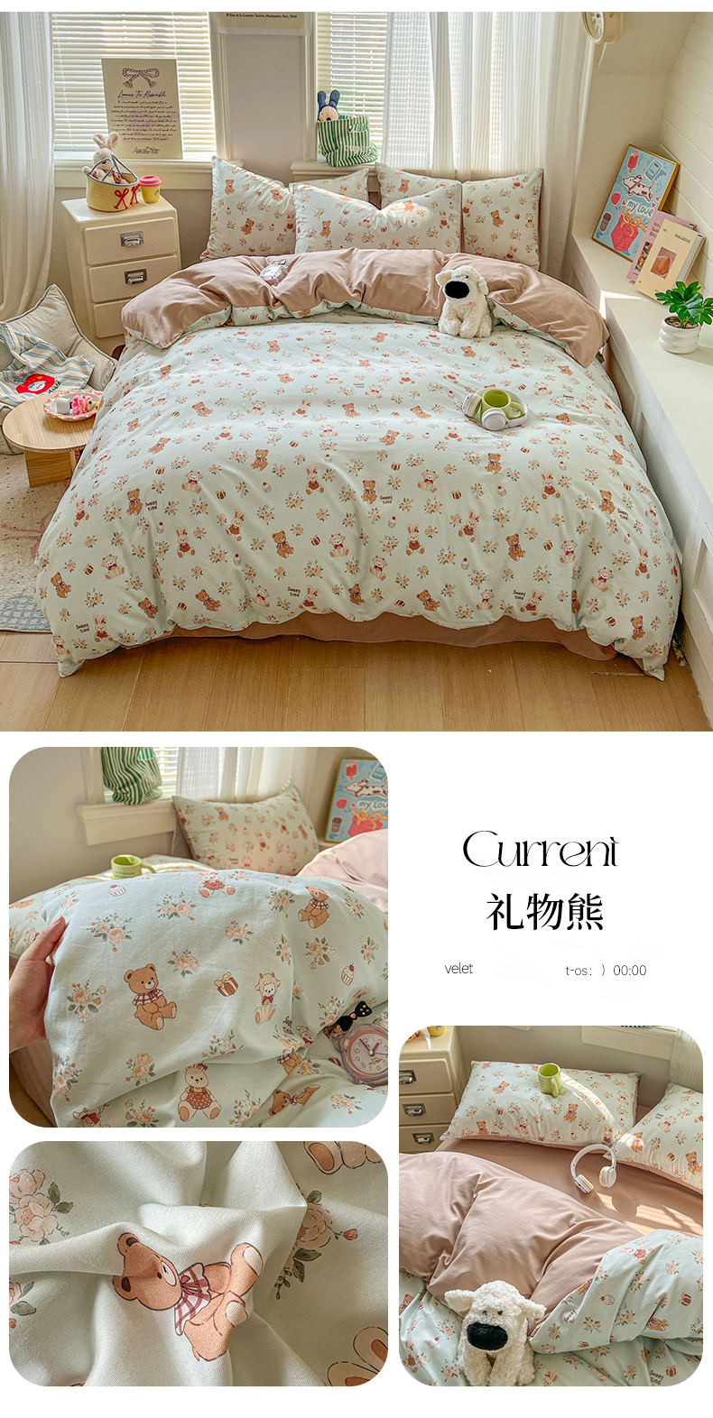 当前位置: 91家纺网 > 商品网购 > 床品套件 > 四件套 > 全棉普通四件套 > 漫仙阁家纺 2026新款纯棉学生宿舍A版100%新疆棉B版古法水洗三件套全棉四件套礼物熊